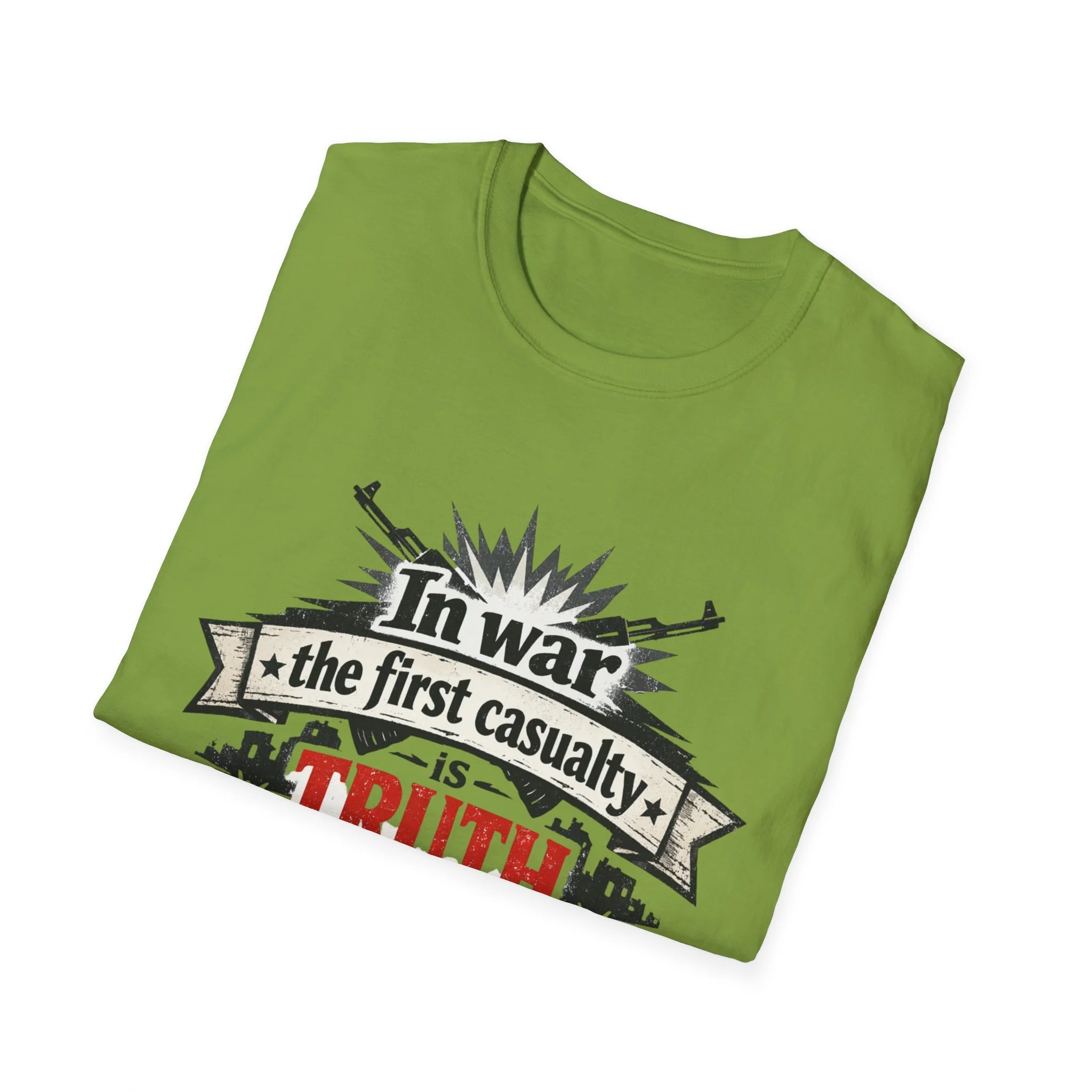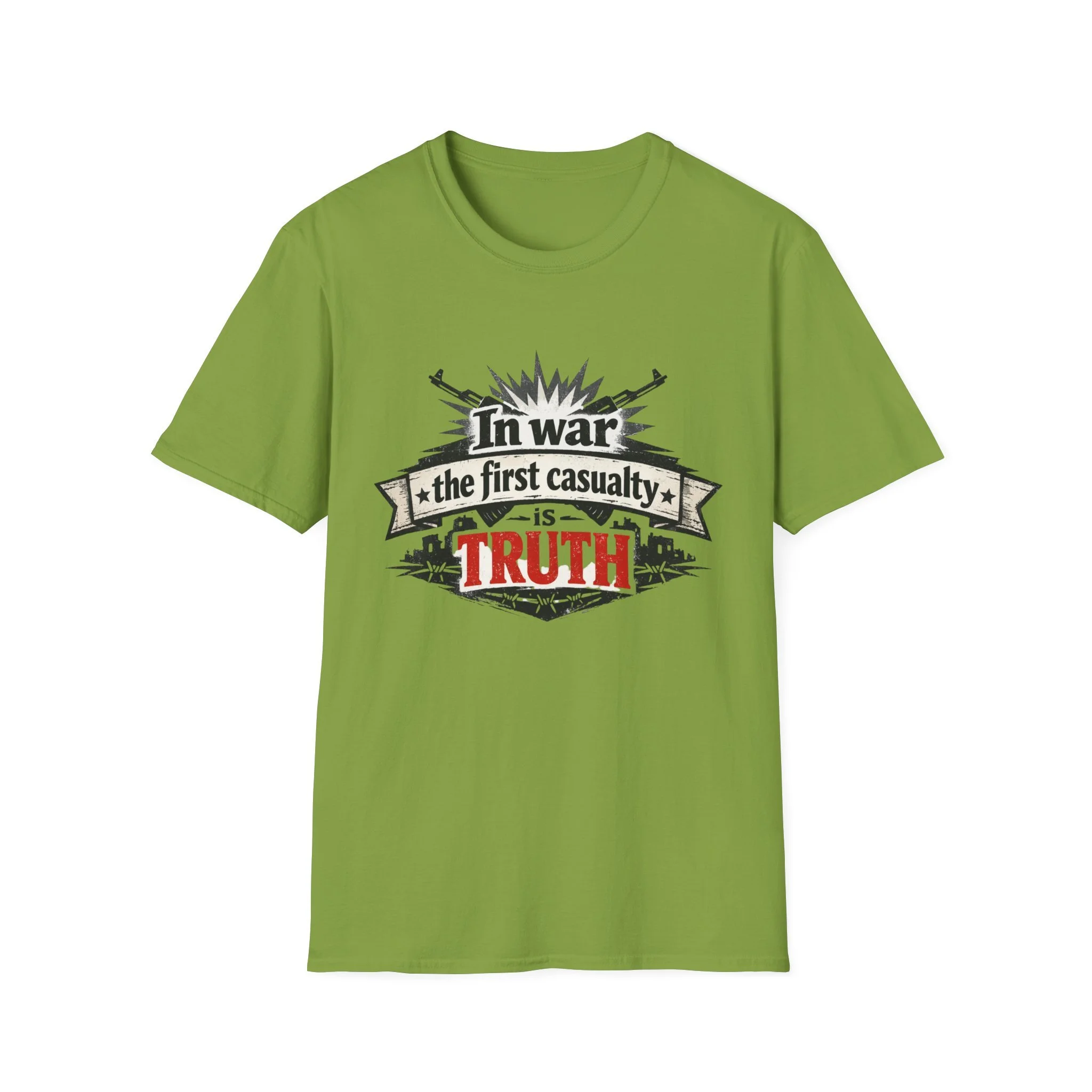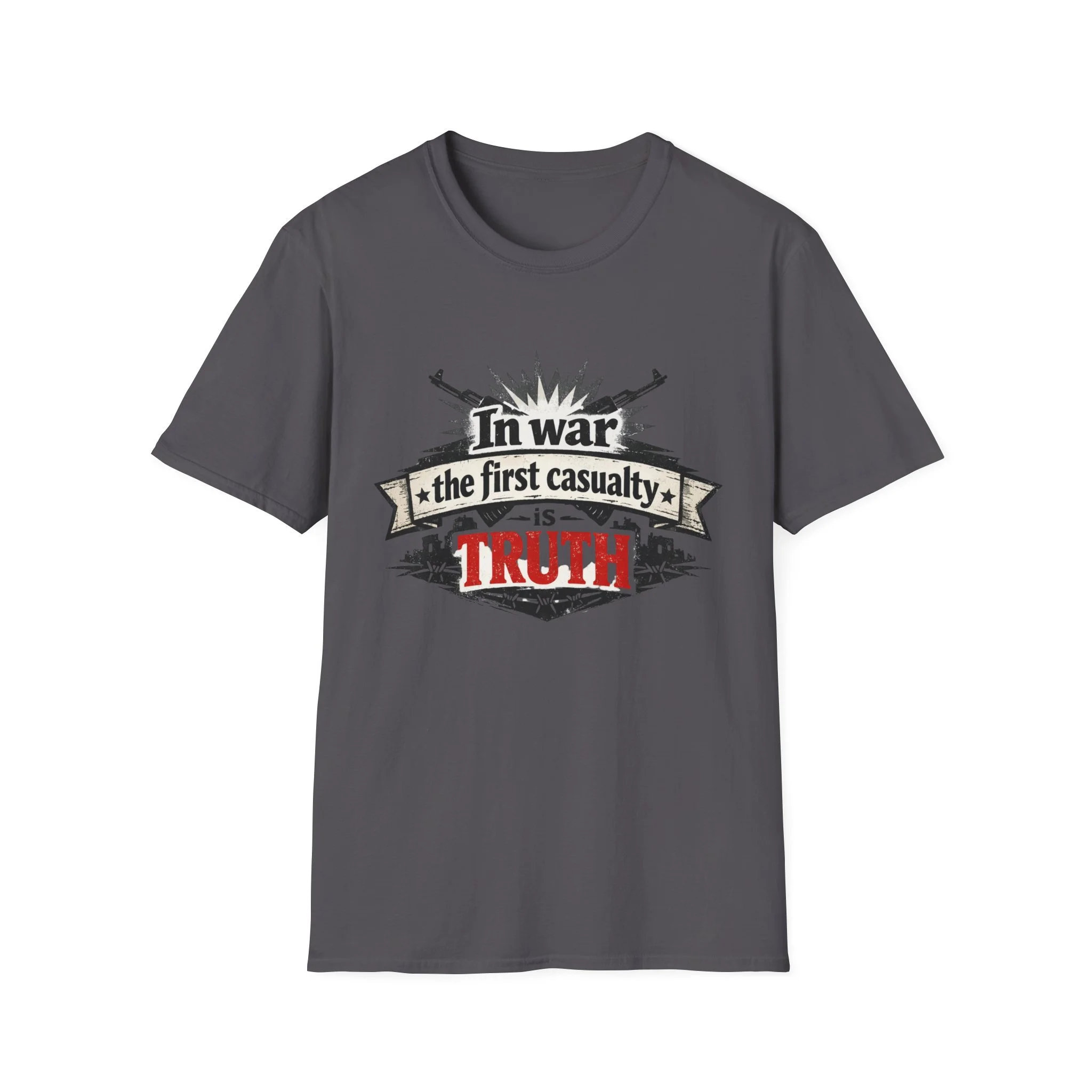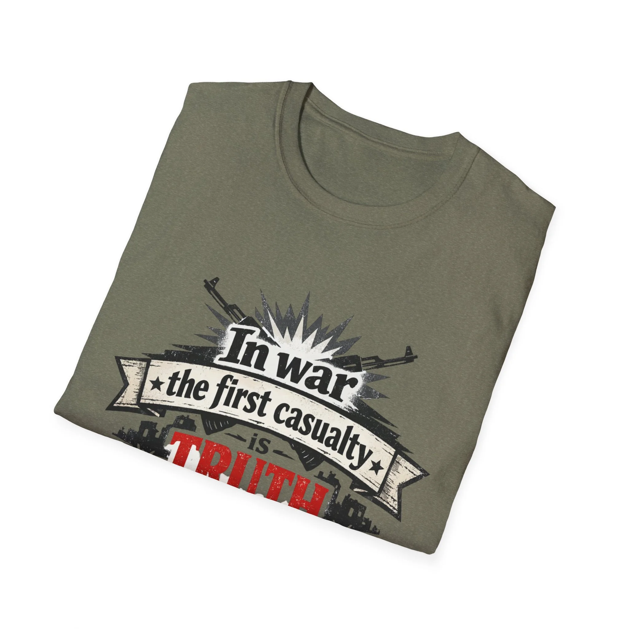 "In War the First Casualty is TRUTH" Military Slogan T-Shirt — Political Humor Tee wartime dry wit unisex