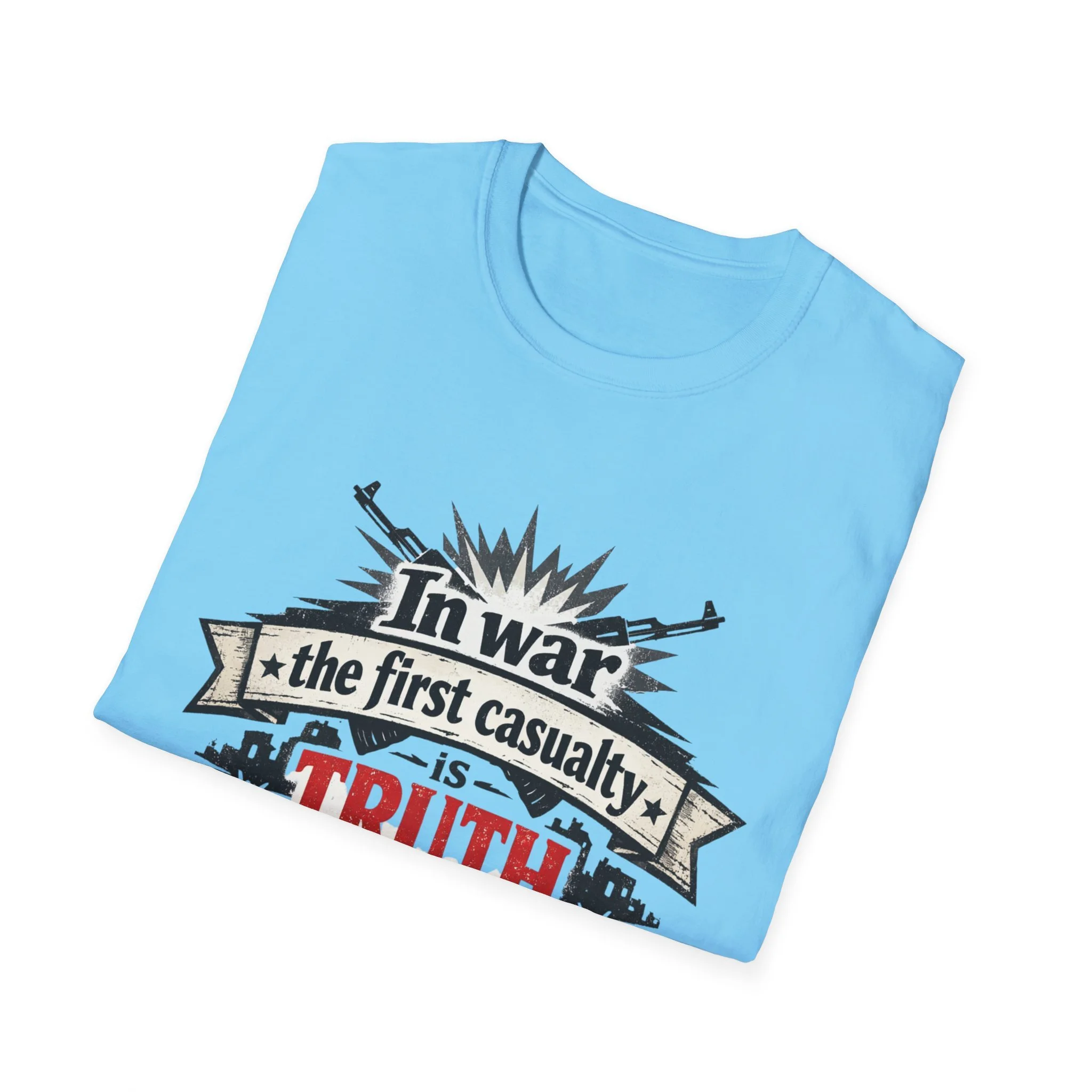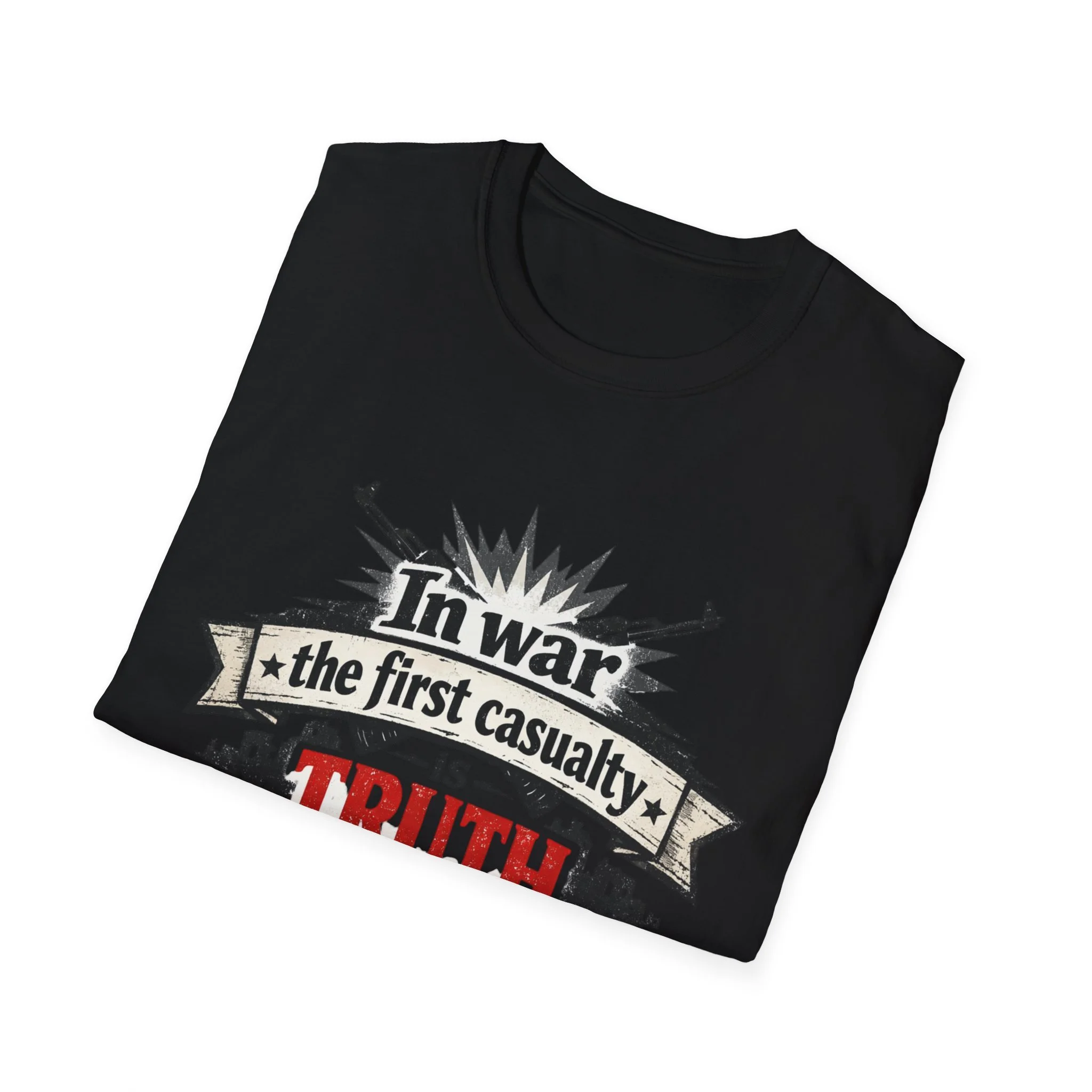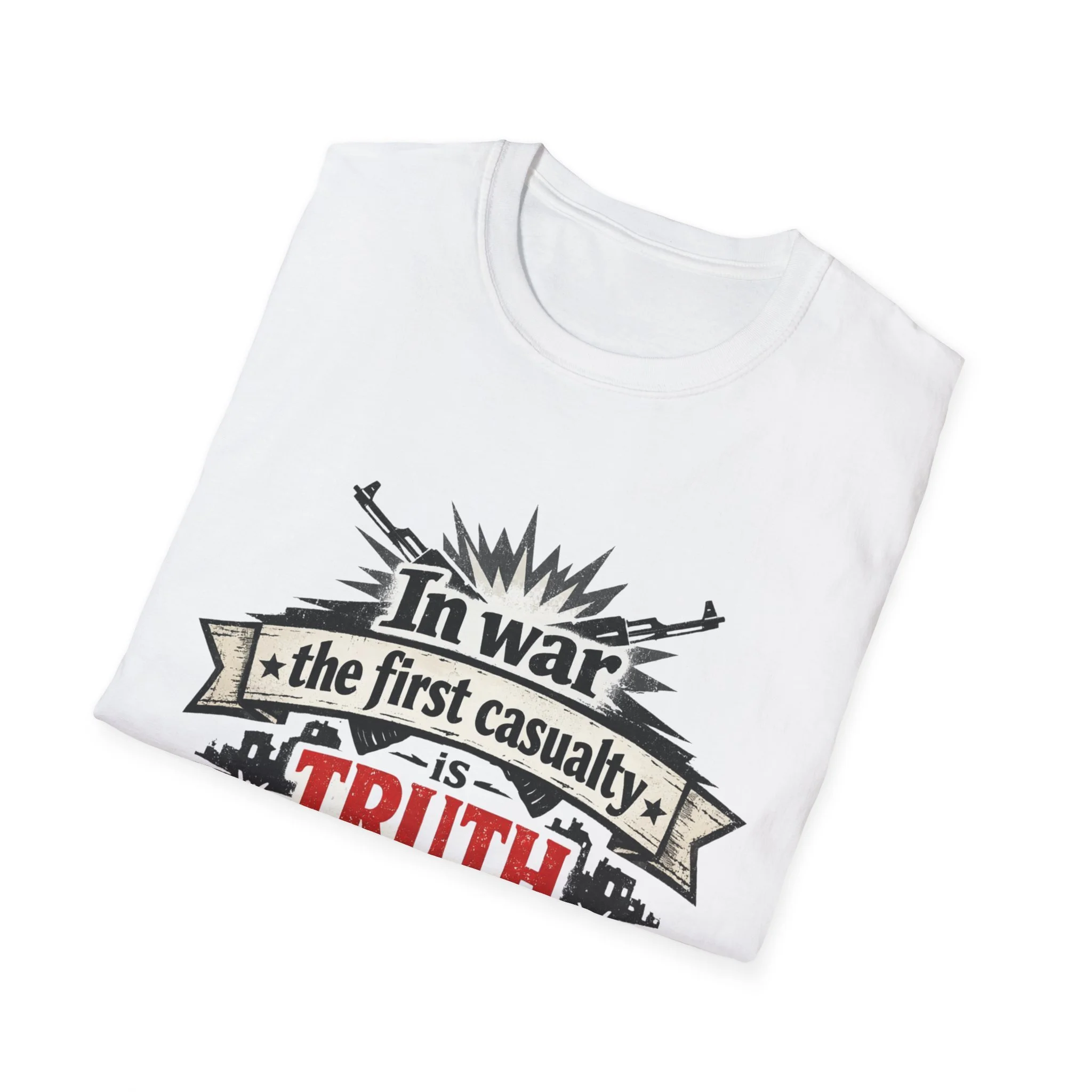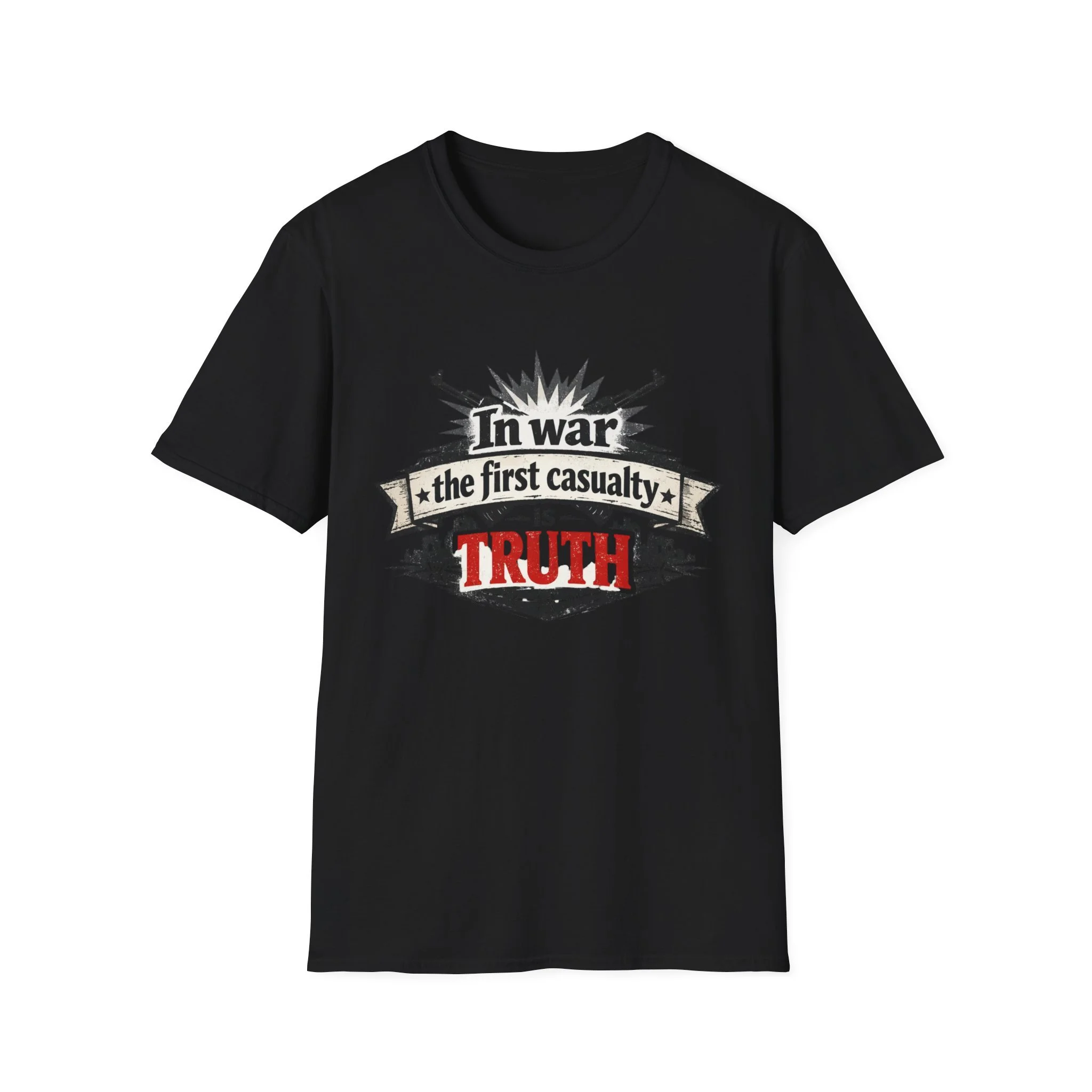 "In War the First Casualty is TRUTH" Military Slogan T-Shirt — Political Humor Tee wartime dry wit unisex