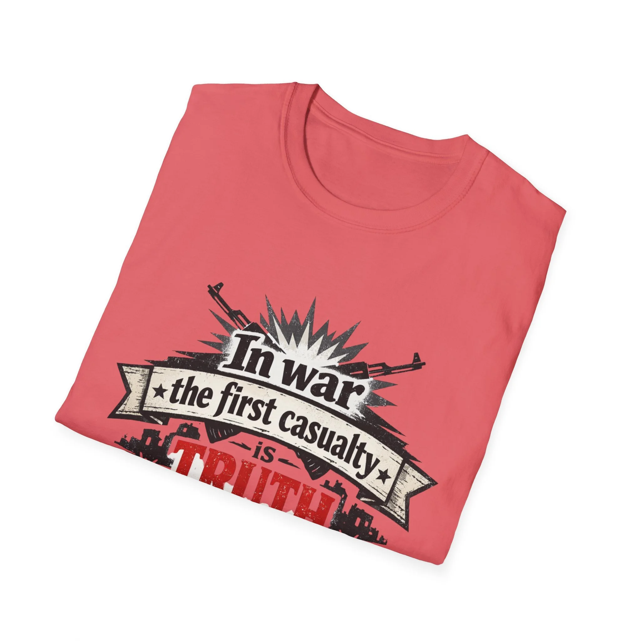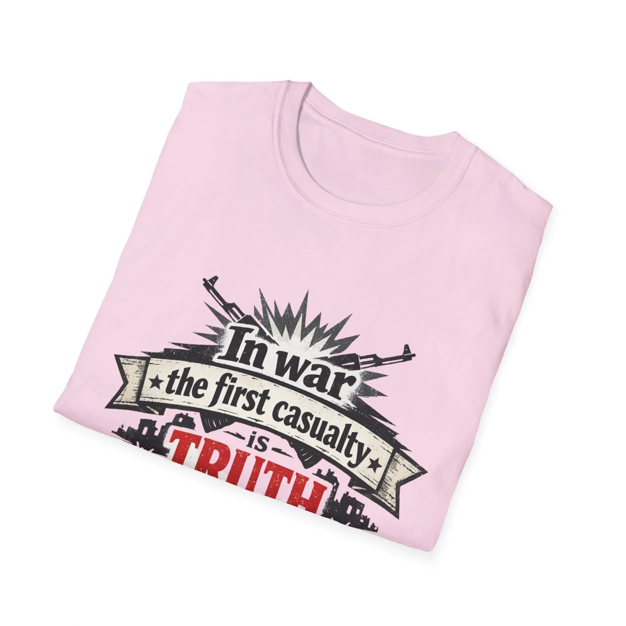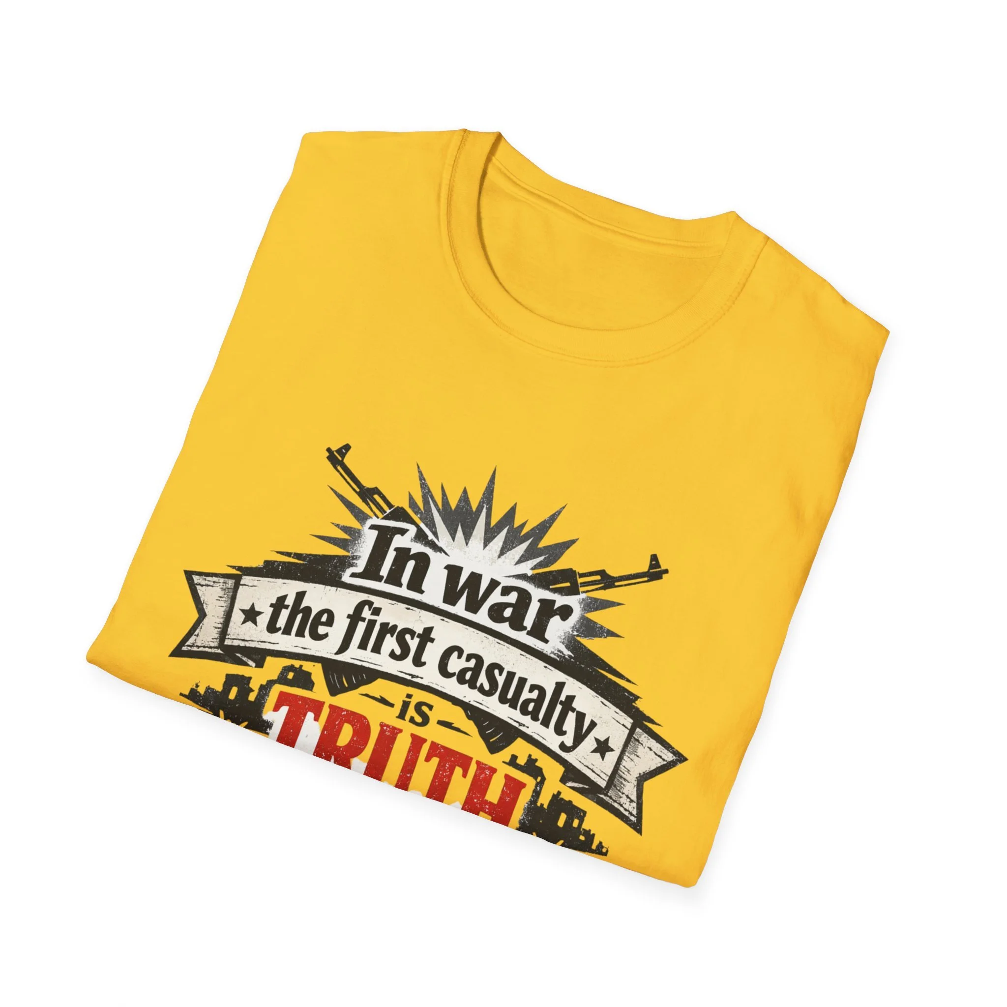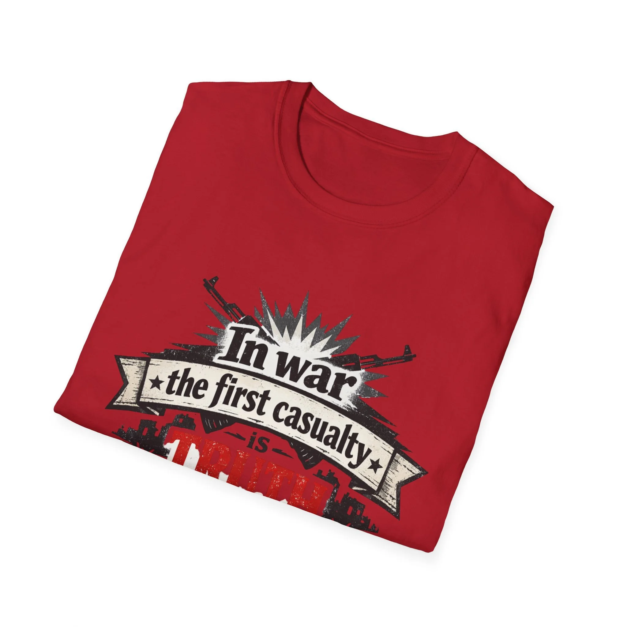 "In War the First Casualty is TRUTH" Military Slogan T-Shirt — Political Humor Tee wartime dry wit unisex