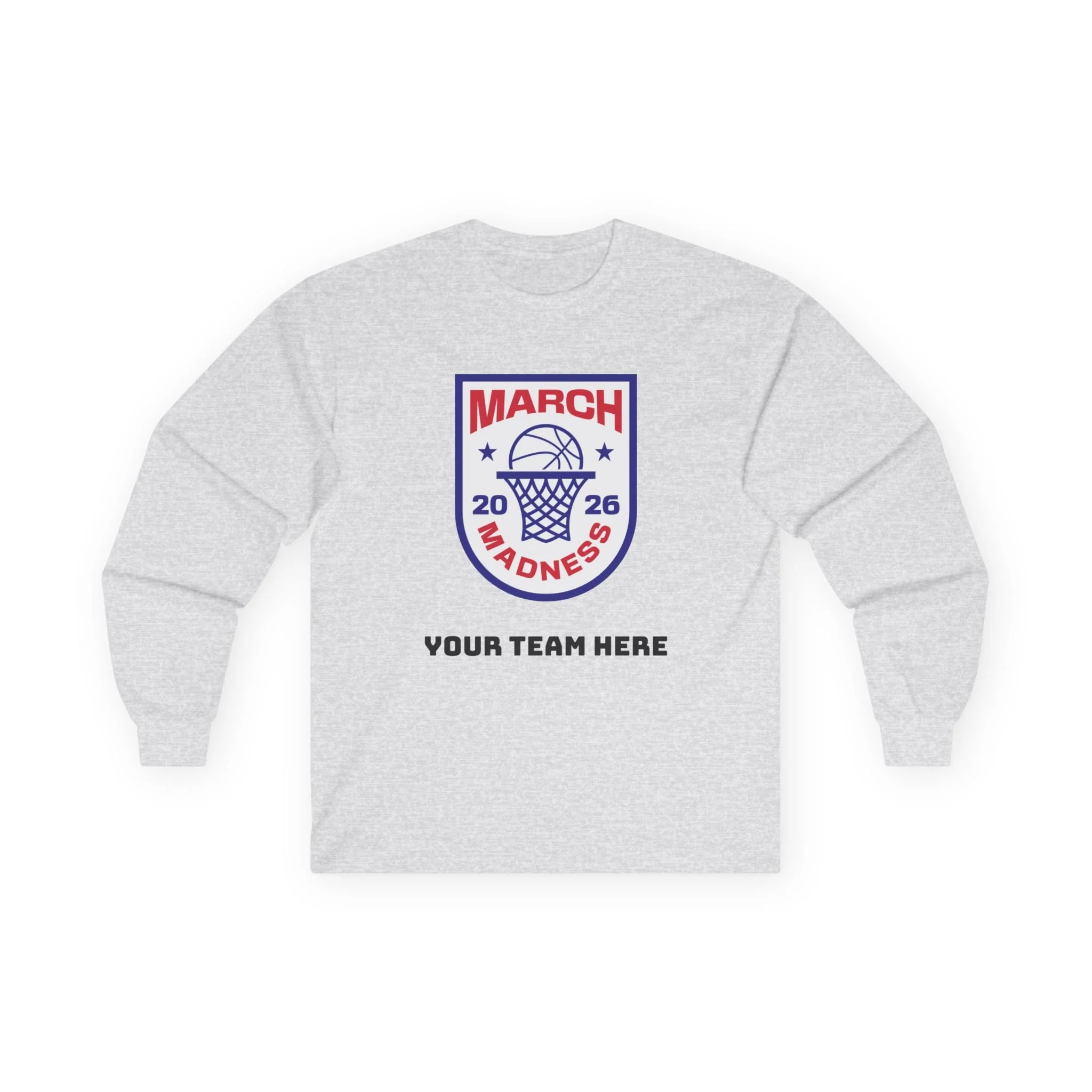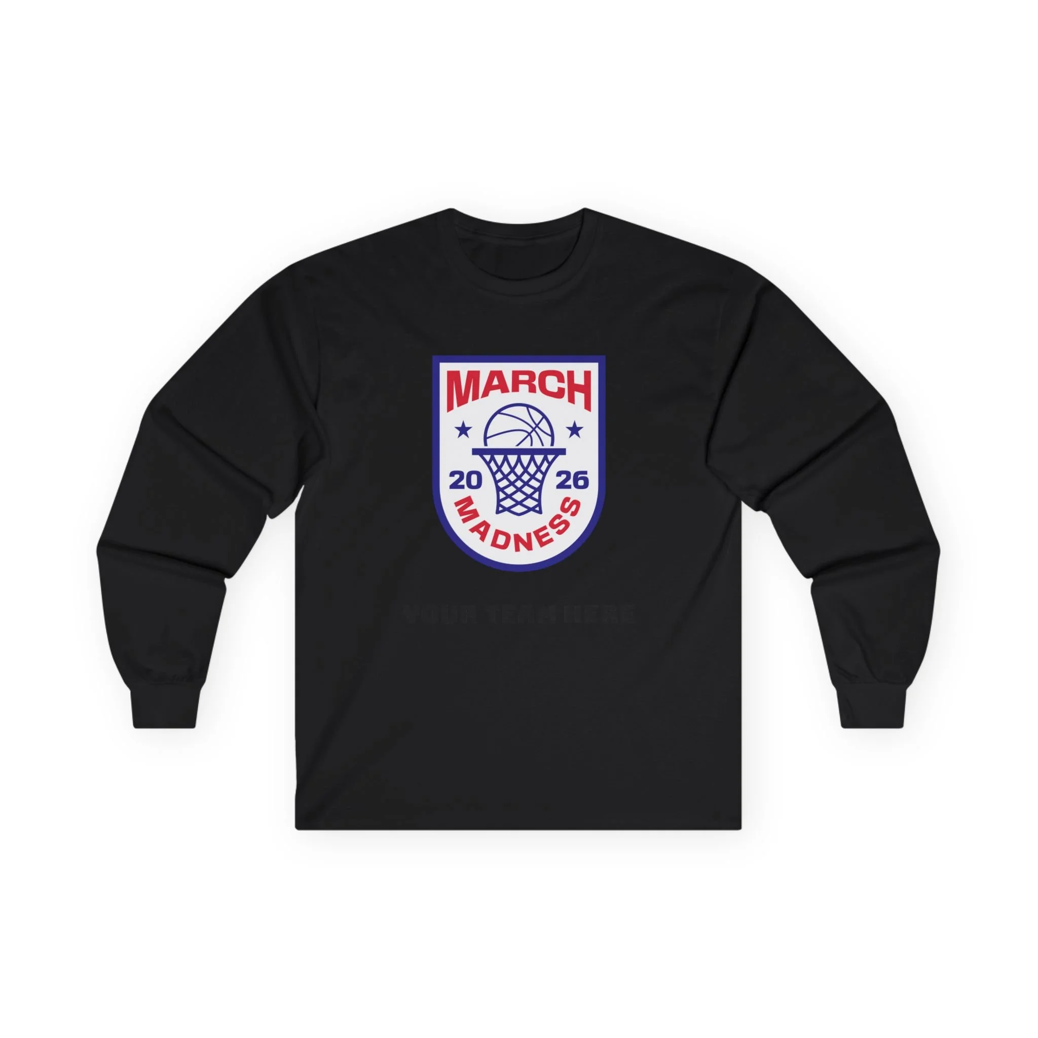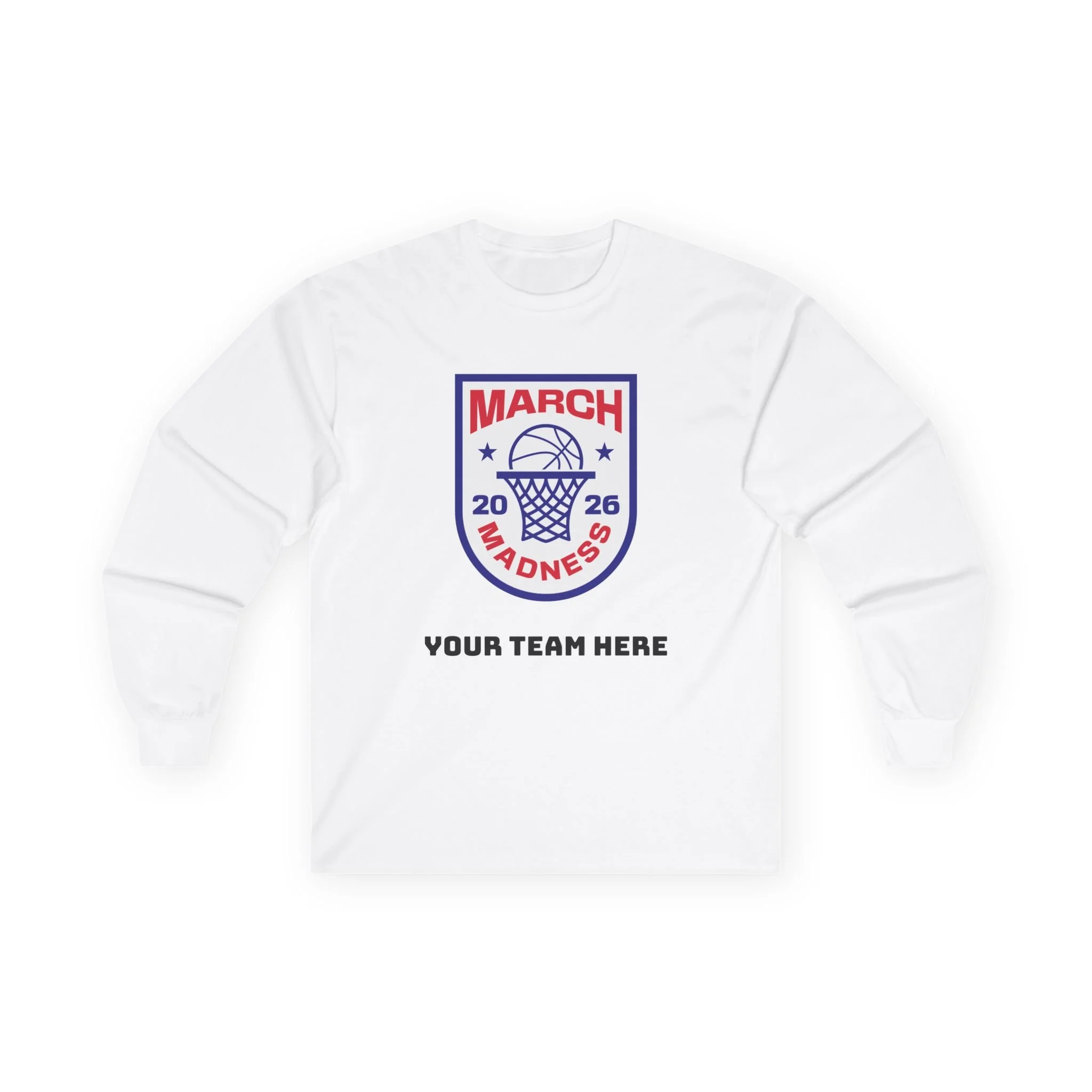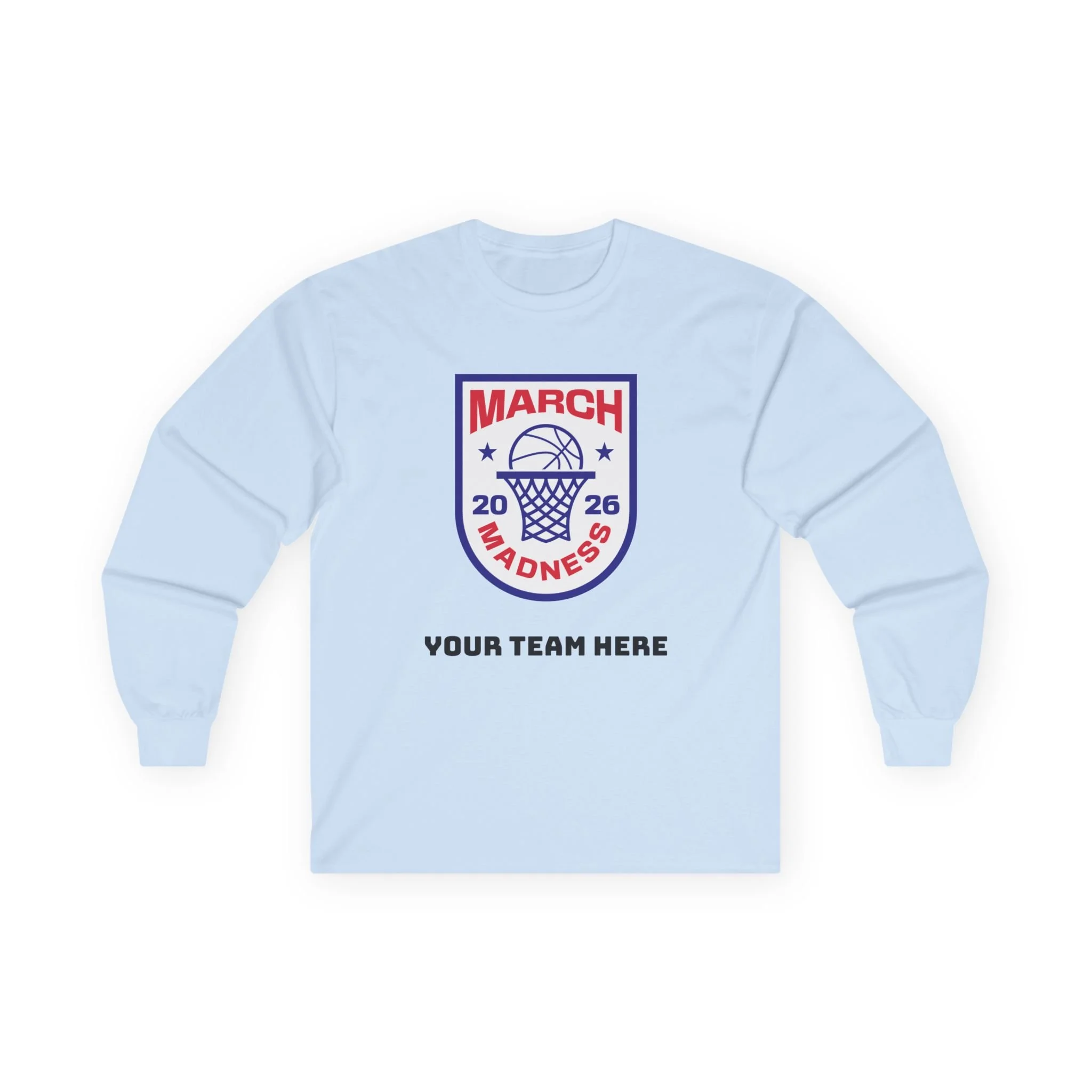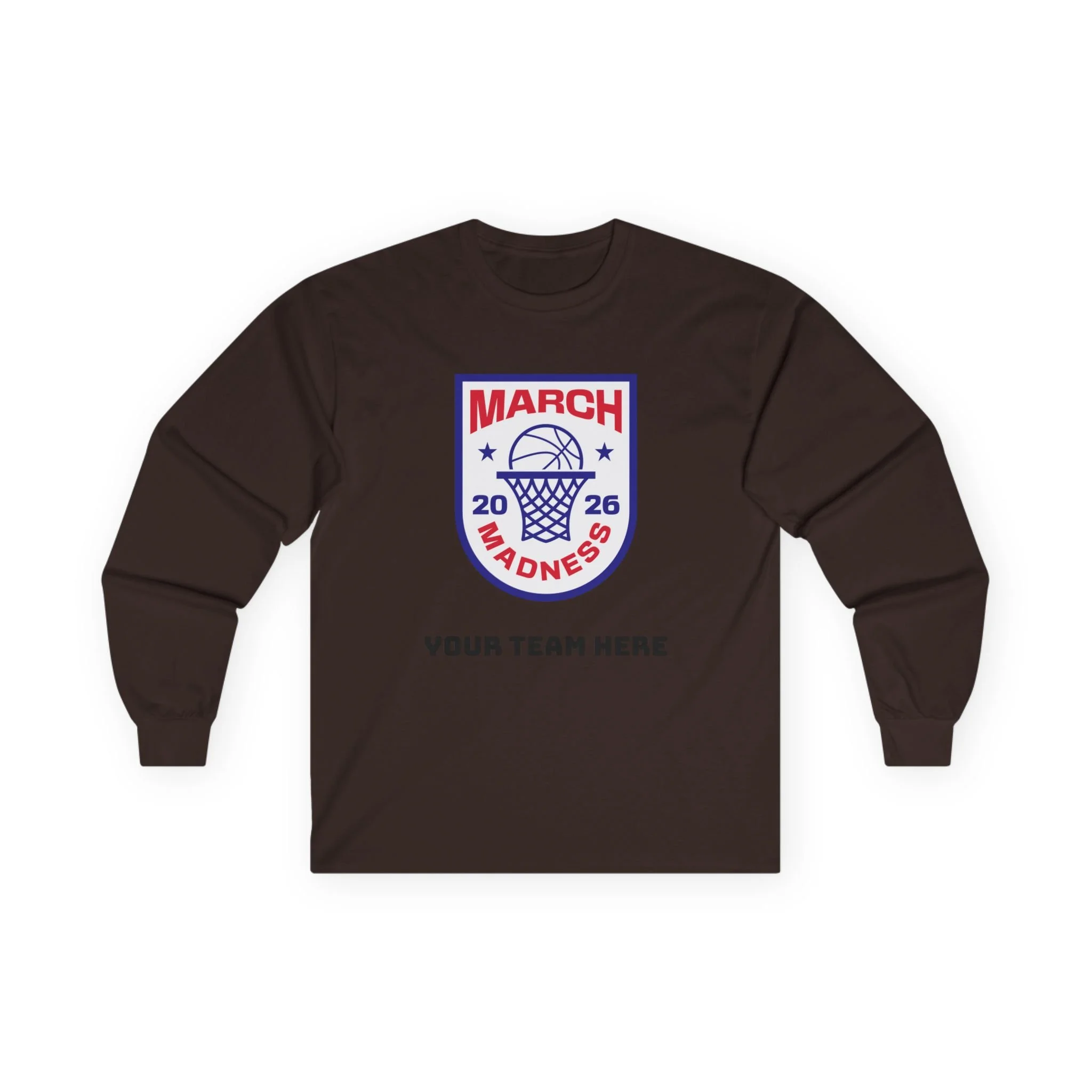 Wear the thrill of tournament season. This long-sleeve tee carries a bold, collegiate-style March Madness crest across the chest — a vintage-feel cotton canvas that settles in like an old favorite. It’s the kind of shirt you reach for on game nights: the crowd’s roar in the stands, the buzzer’s last echo, and your team name printed right below the crest. Lightweight enough for layered looks, but with a thicker, retro hand that feels substantial without weighing you down. Let it be the layer you throw on for bracket parties, late-night watch sessions, or chilly practices — it’s comfortable, familiar, and built to keep its shape through every season.