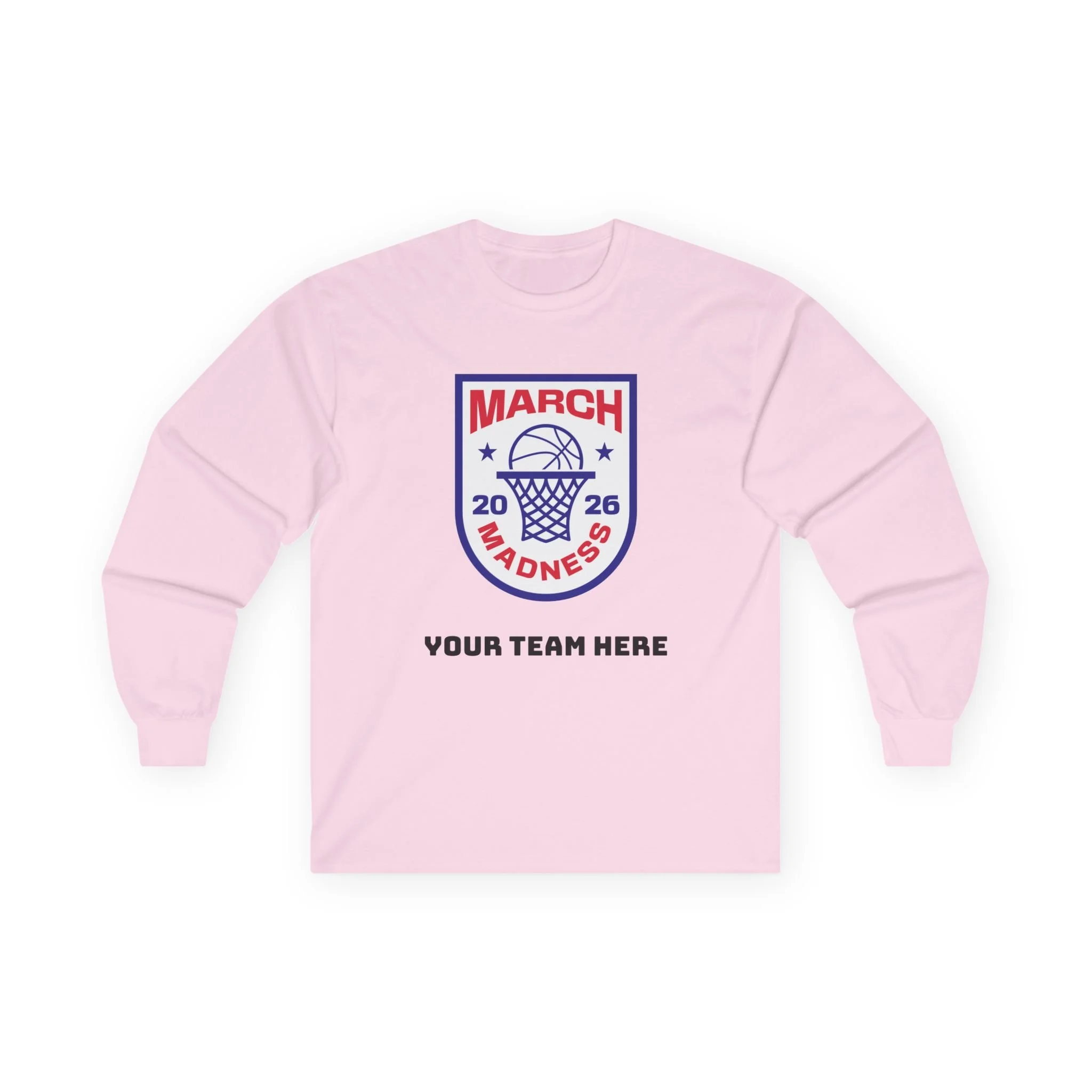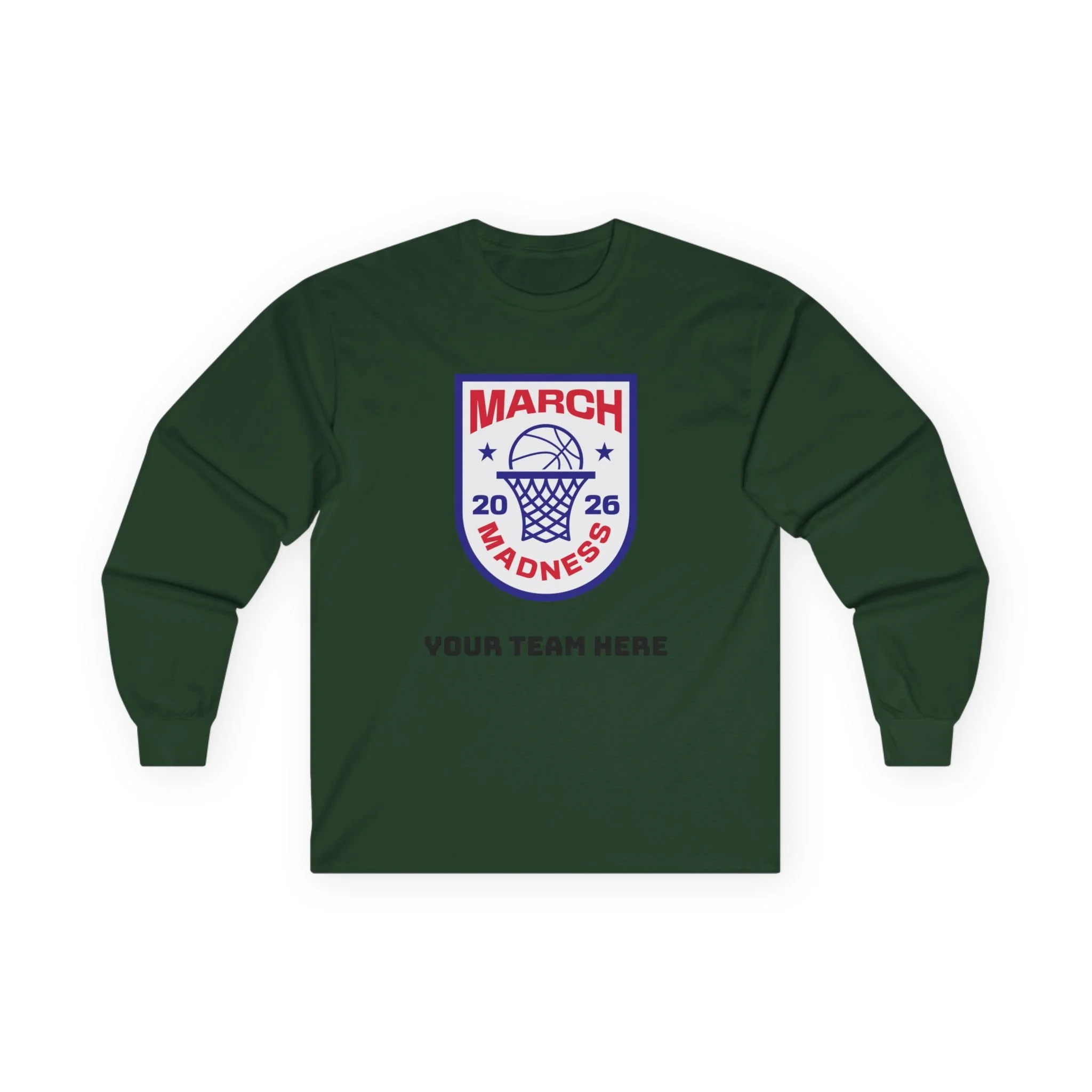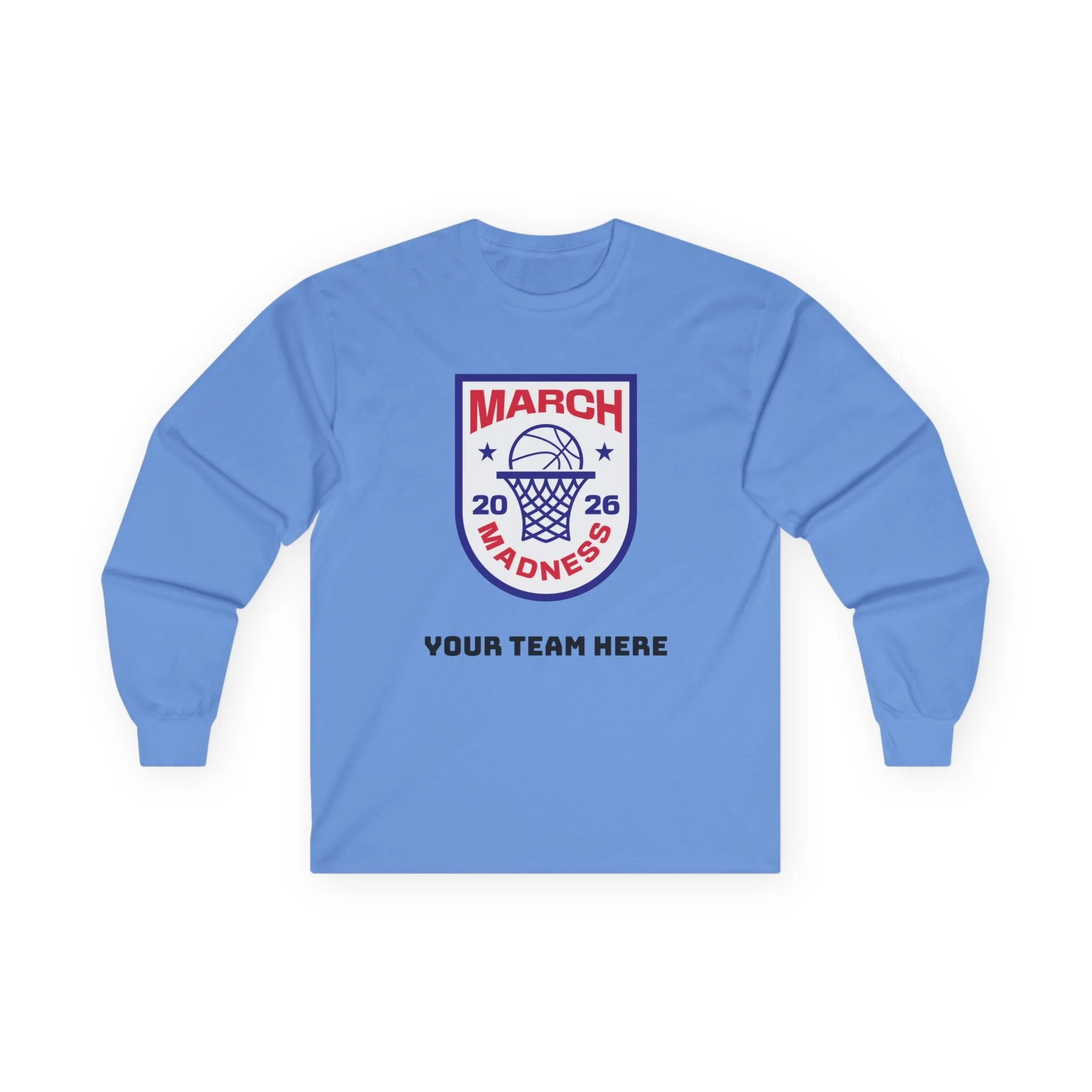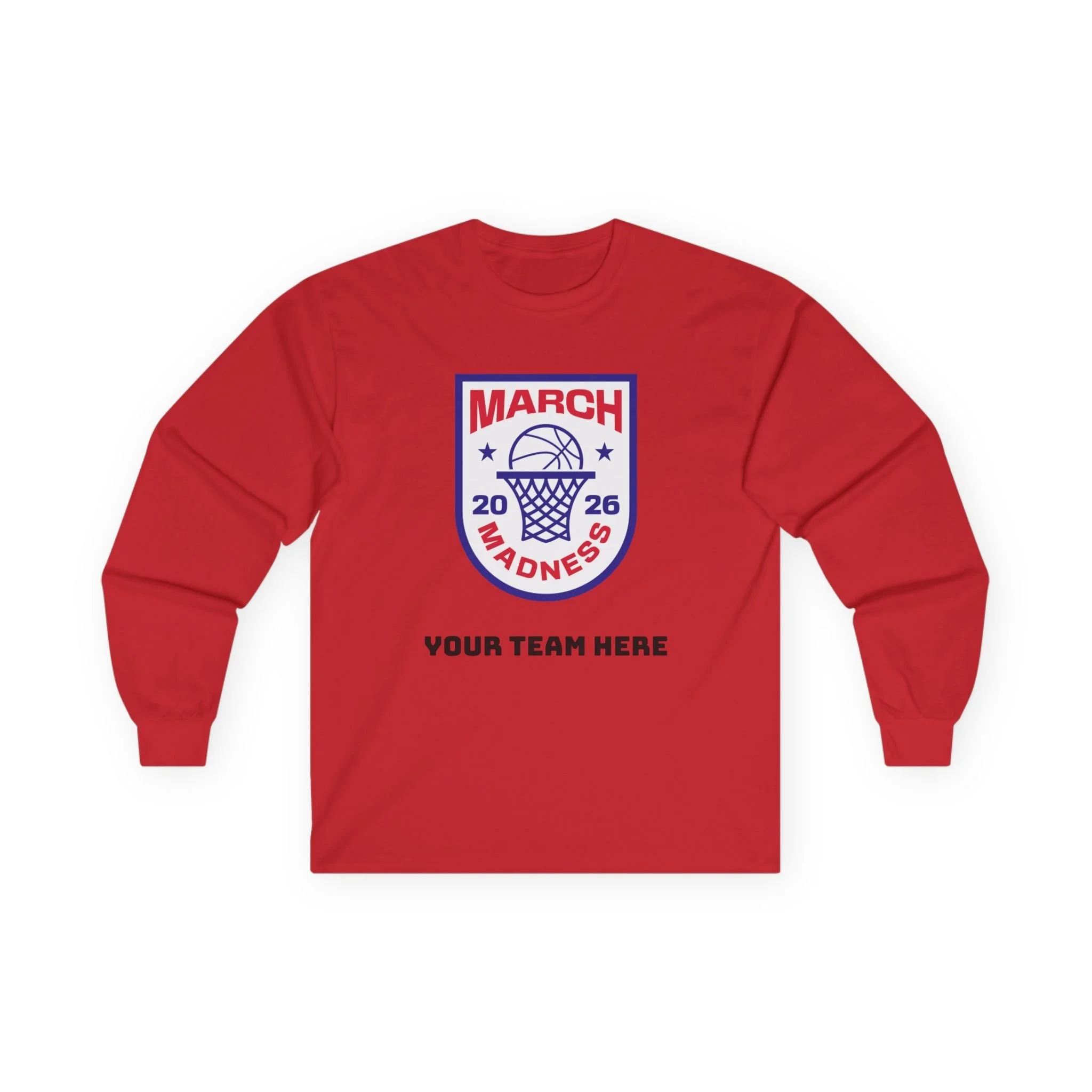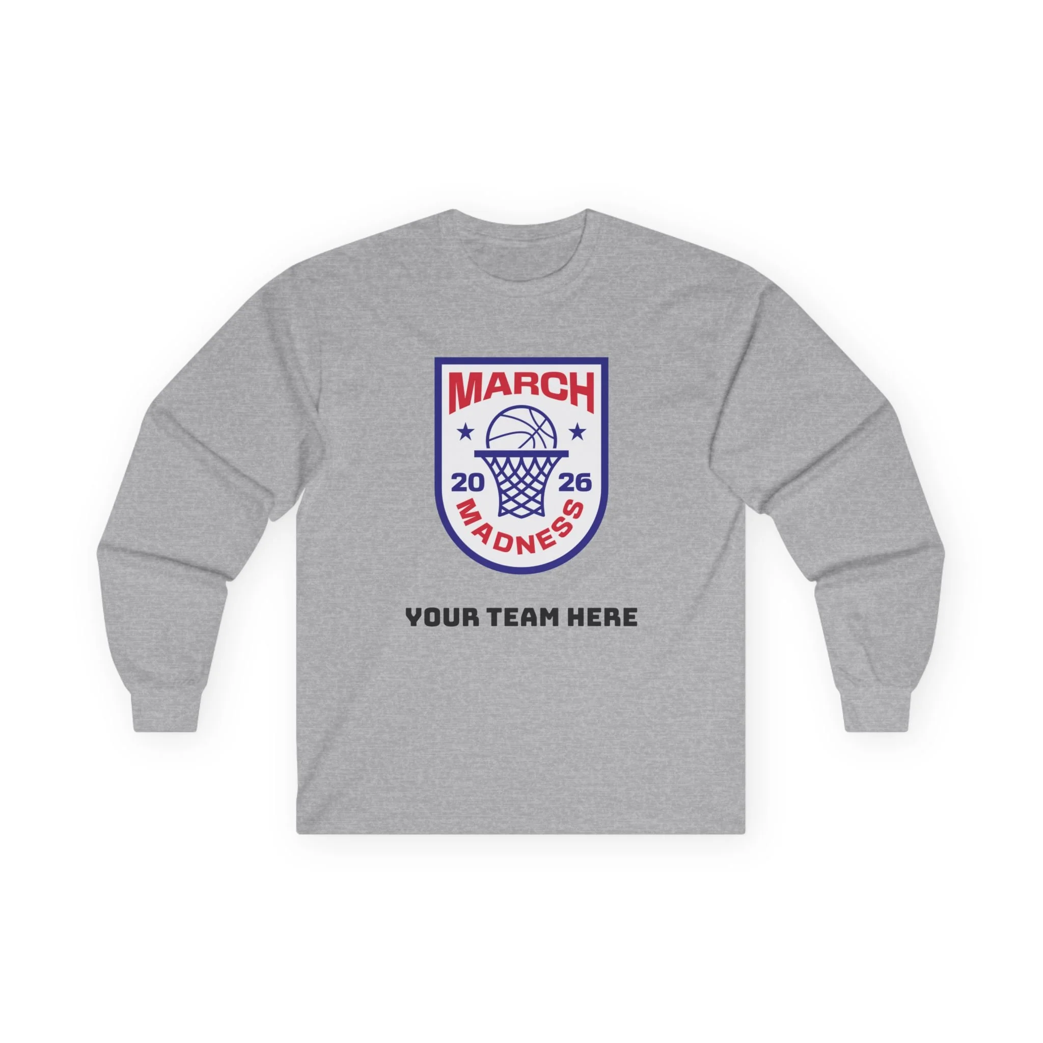 Wear the thrill of tournament season. This long-sleeve tee carries a bold, collegiate-style March Madness crest across the chest — a vintage-feel cotton canvas that settles in like an old favorite. It’s the kind of shirt you reach for on game nights: the crowd’s roar in the stands, the buzzer’s last echo, and your team name printed right below the crest. Lightweight enough for layered looks, but with a thicker, retro hand that feels substantial without weighing you down. Let it be the layer you throw on for bracket parties, late-night watch sessions, or chilly practices — it’s comfortable, familiar, and built to keep its shape through every season.