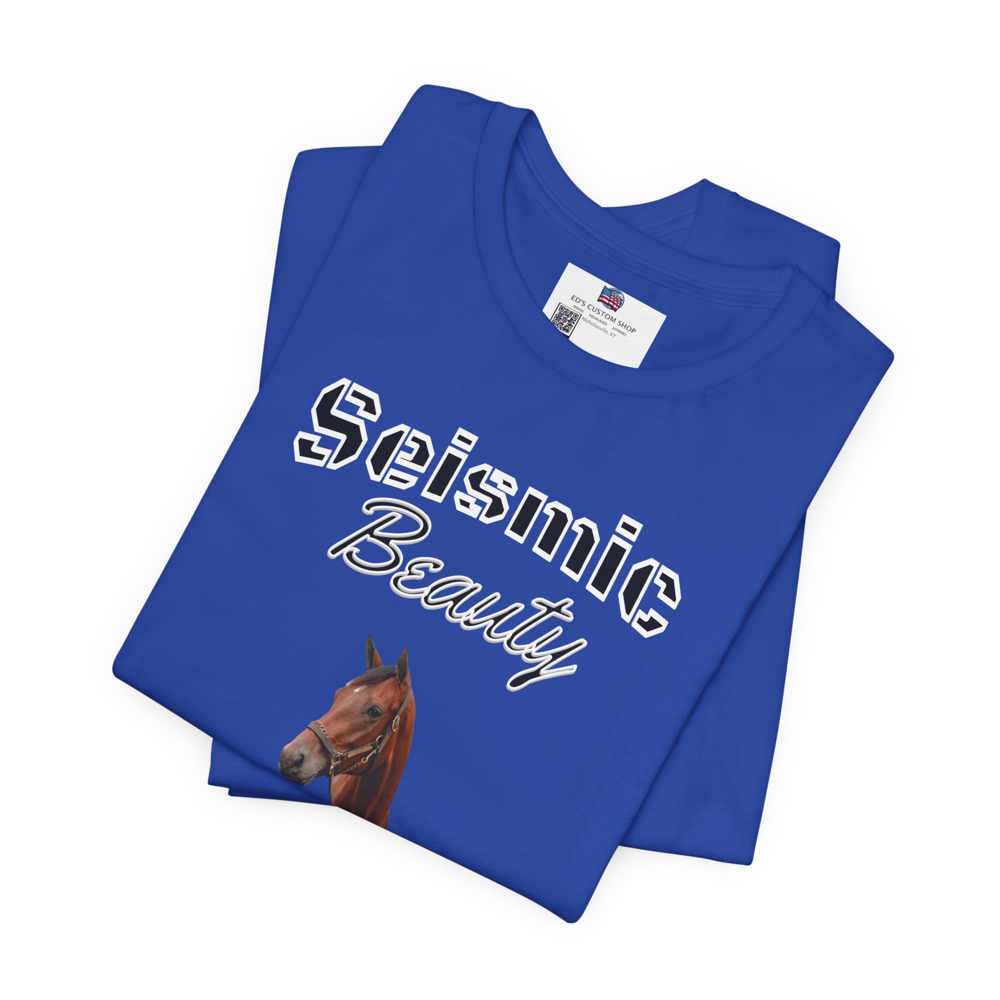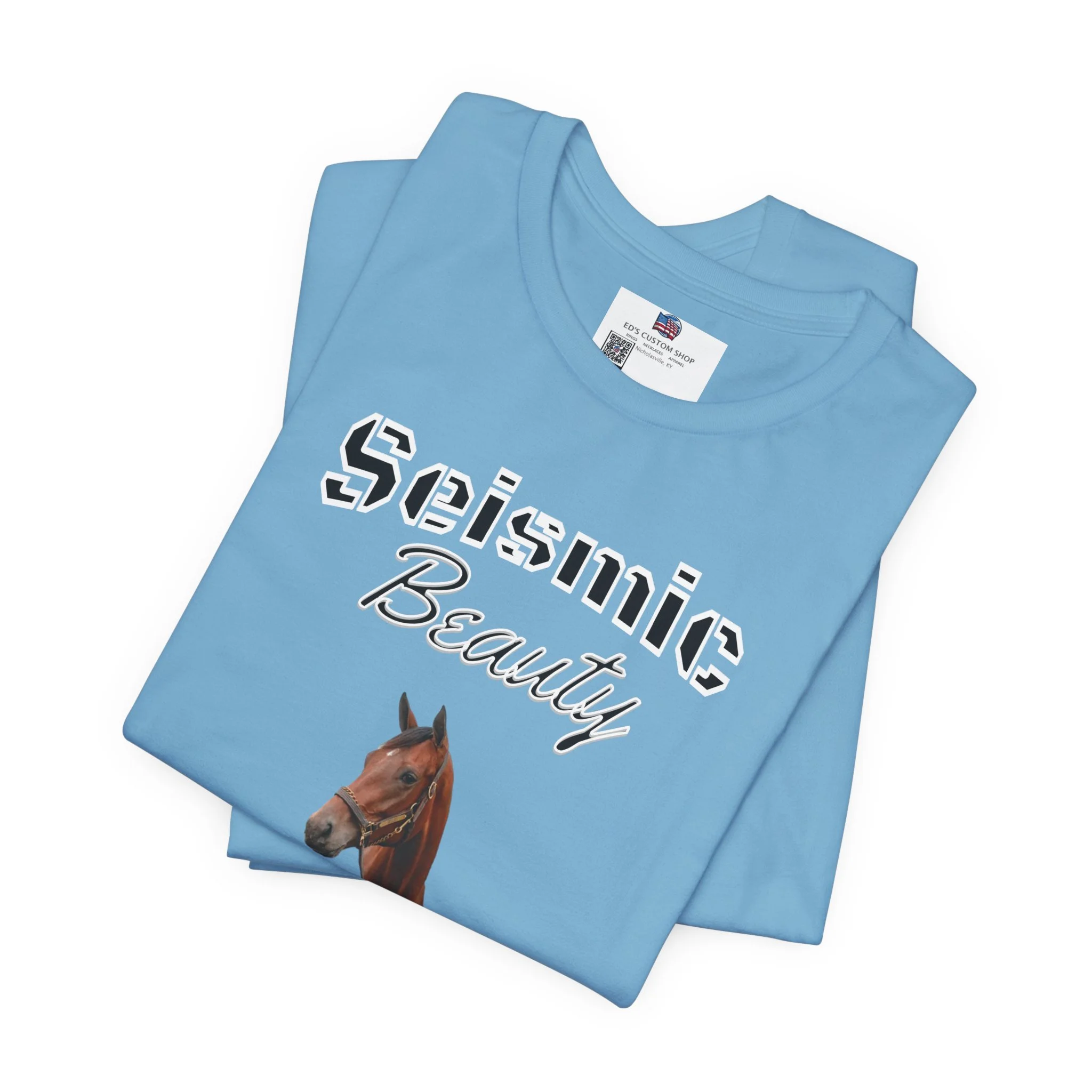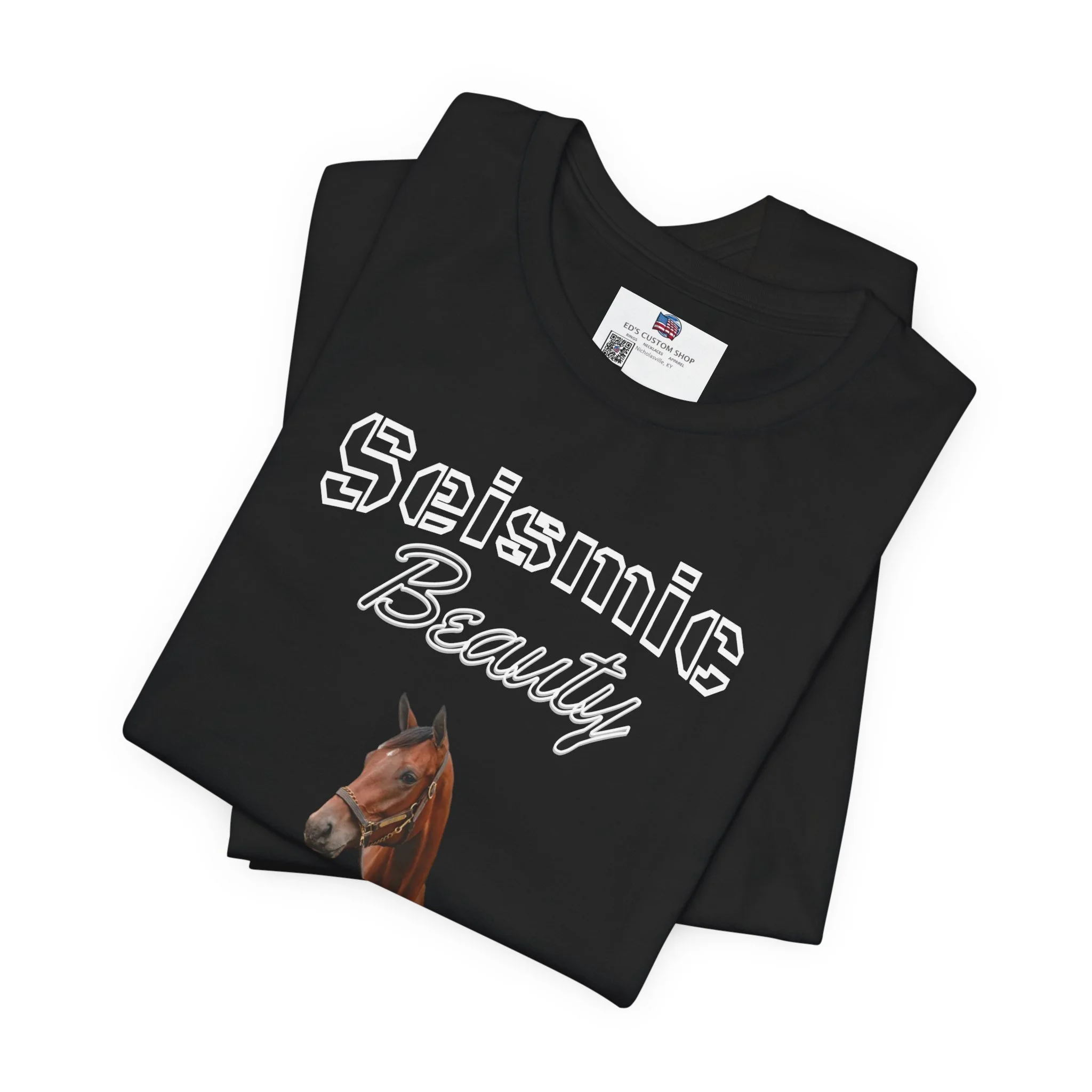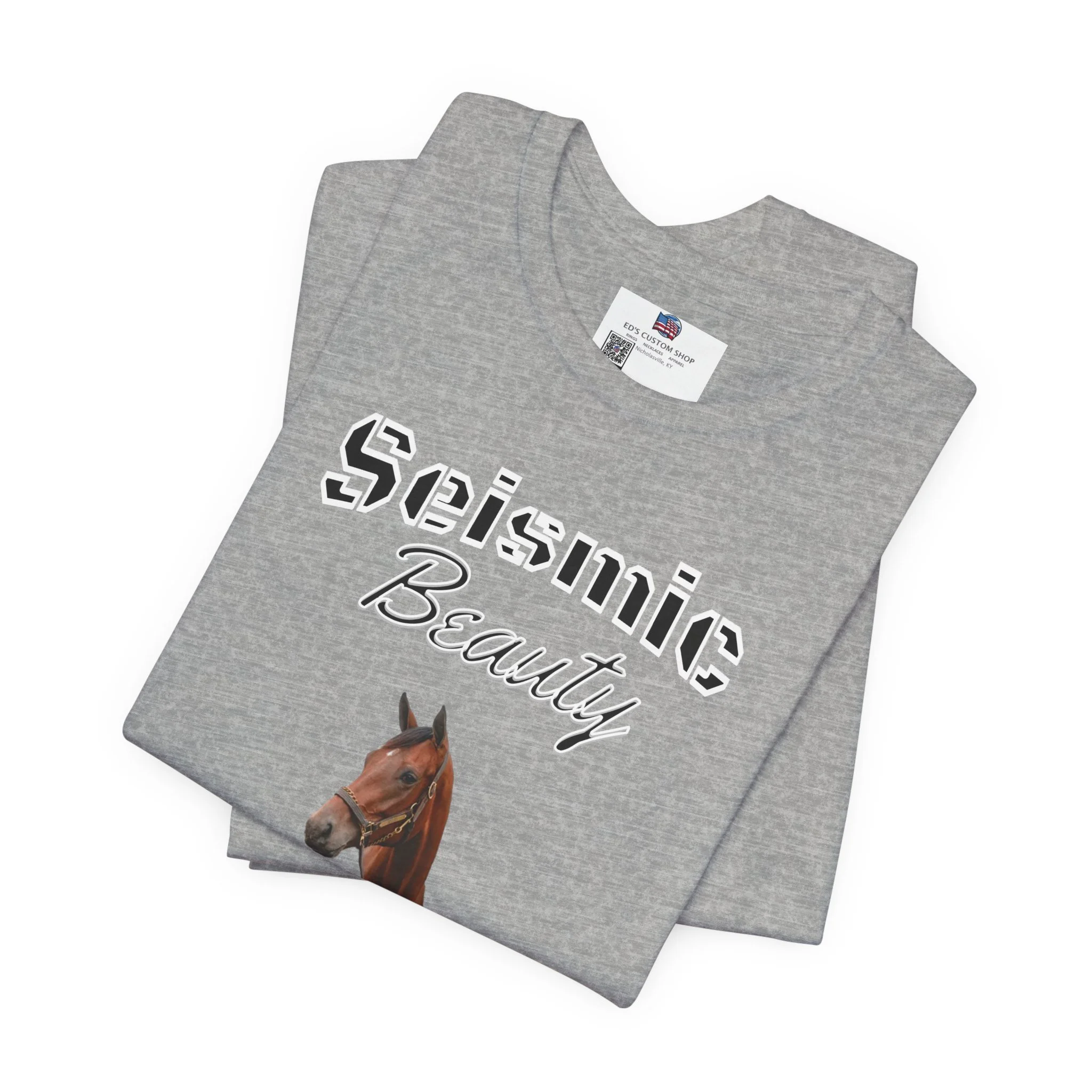 Celebrate the beauty of horse racing with this Seismic Beauty Filly Horse Breeders' Cup Winner Del Mar Winner. This tee exudes a classic yet sporty vibe, perfect for horse lovers and fans of the Breeders Cup. It fits seamlessly into a casual or semi-formal wardrobe, ideal for everyday wear or special events.