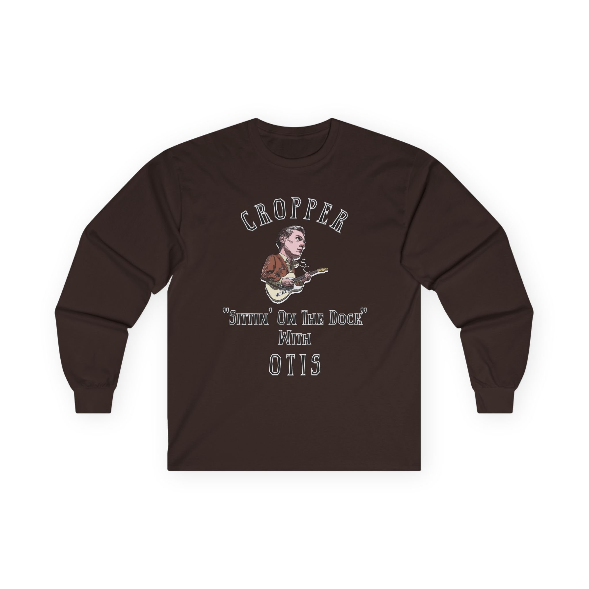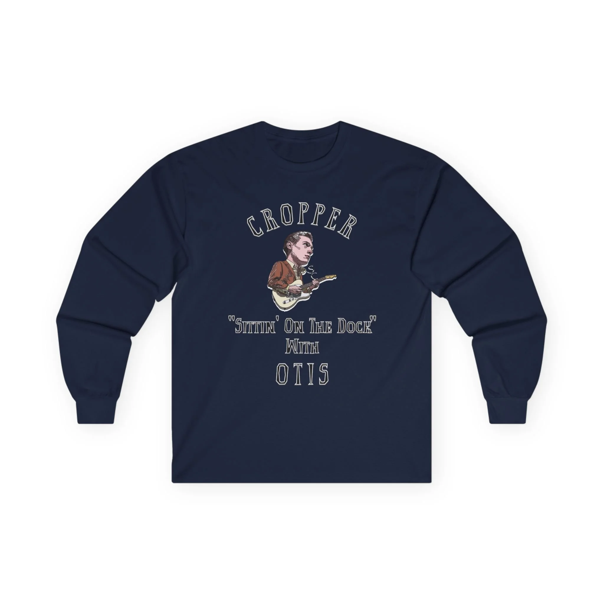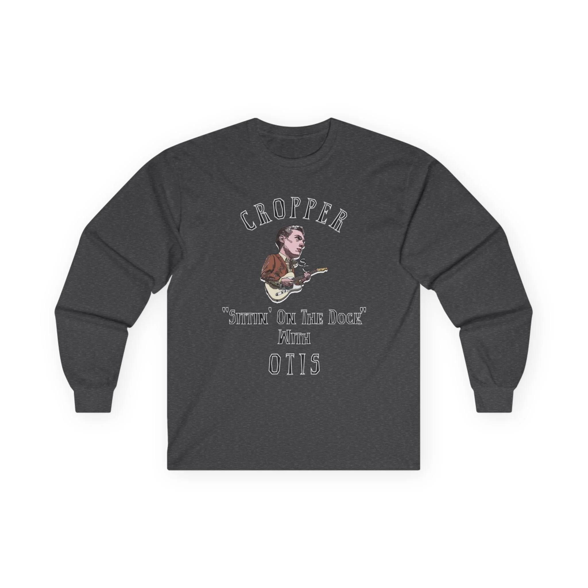 This long-sleeve tee carries the weathered warmth of a late-night Stax record — gritty, soulful, and quietly proud. The design calls to mind Steve Cropper and Otis Redding, the soft hum of Booker T. & The M.G.'s, and the image of sitting on a wooden dock as a cold wind moves through the harbor lights. It settles comfortably over your shoulders, like a familiar chord that keeps playing. Wear it to vinyl nights, back-porch jam sessions, or when you’re tracing the lines of a favorite album cover. The fabric has a vintage weight and a lived-in feel that matches the music’s mellow toughness, and the tubular knit construction gives a clean, uninterrupted silhouette that looks right whether layered under a jacket or on its own.