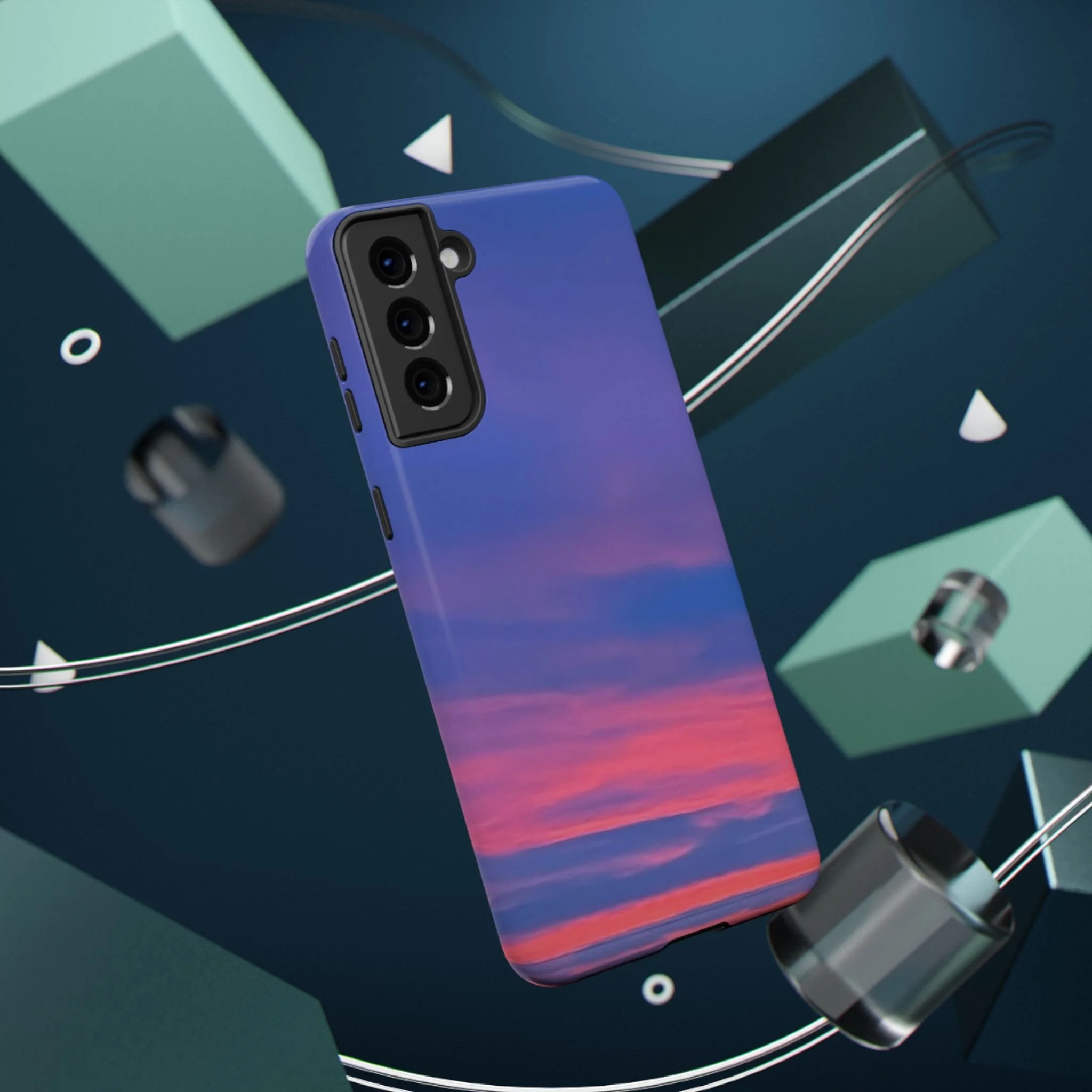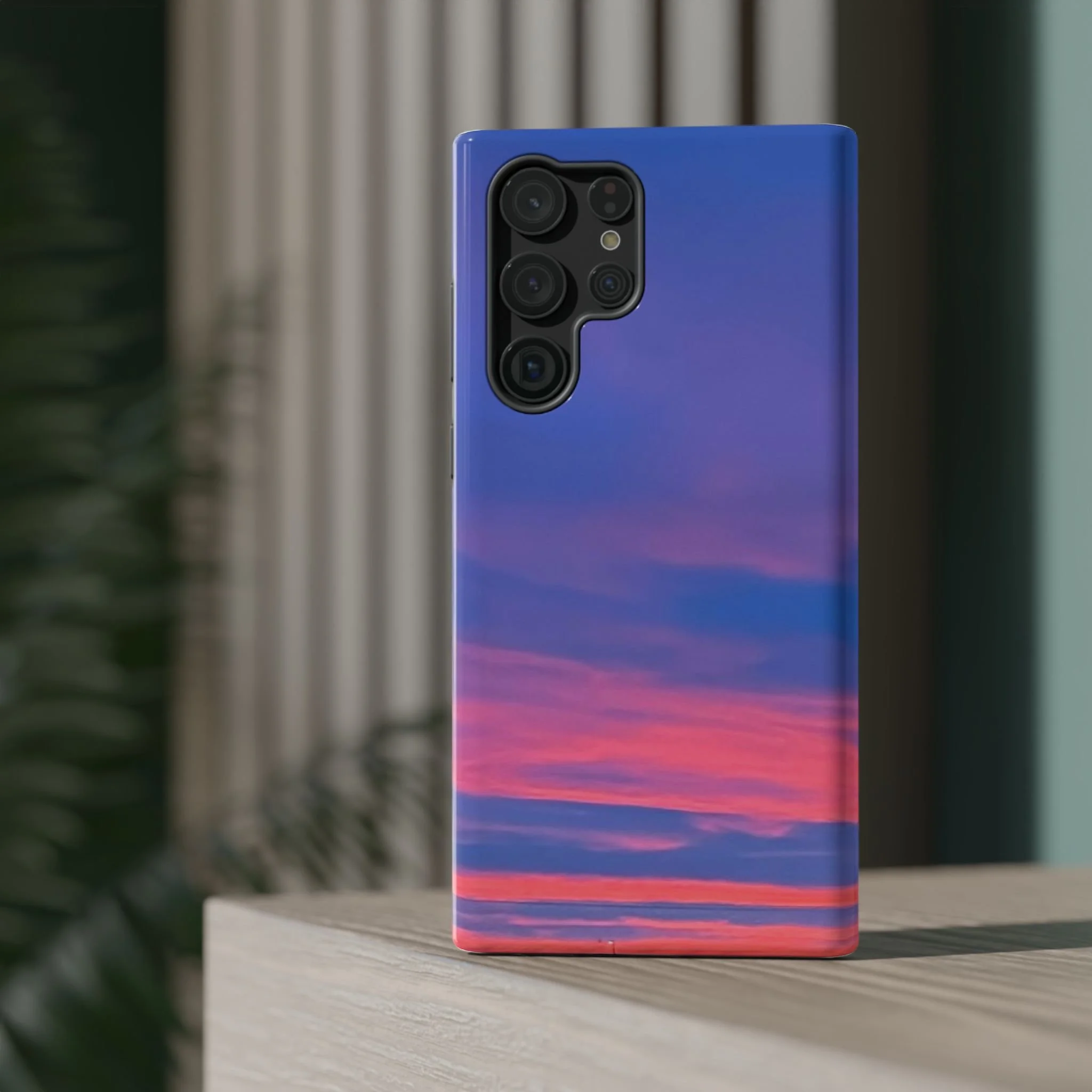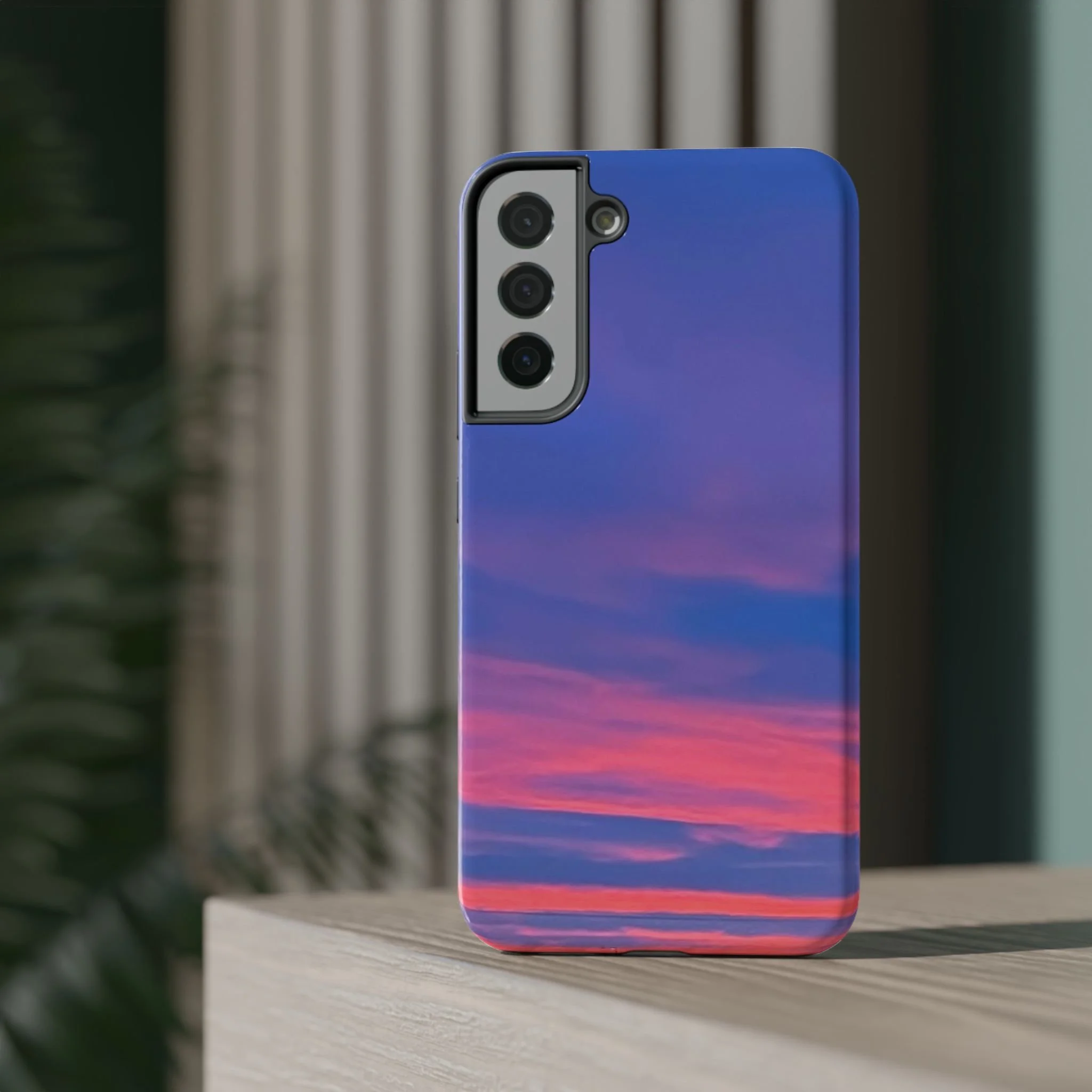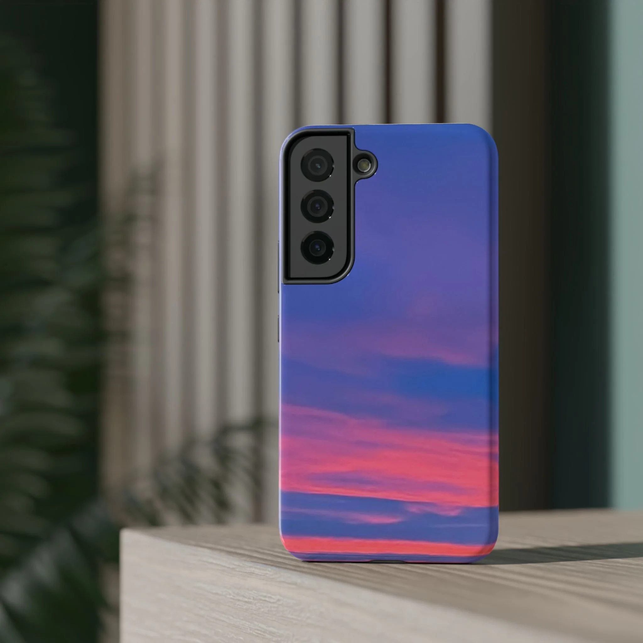 Carry a slice of evening sky with you. This impact-resistant phone case wraps a soft gradient sunset—deep indigo melting into coral-pink—around a dual-layer shell that absorbs daily knocks. It feels smooth in either glossy or matte, and the full-wrap print keeps the image seamless from edge to edge. The slim outer polycarbonate and removable black TPU liner work together to protect edges and corners while still allowing wireless charging and easy button access. For those who pause to watch dusk unfold, this case turns a small everyday item into a calm, portable moment.