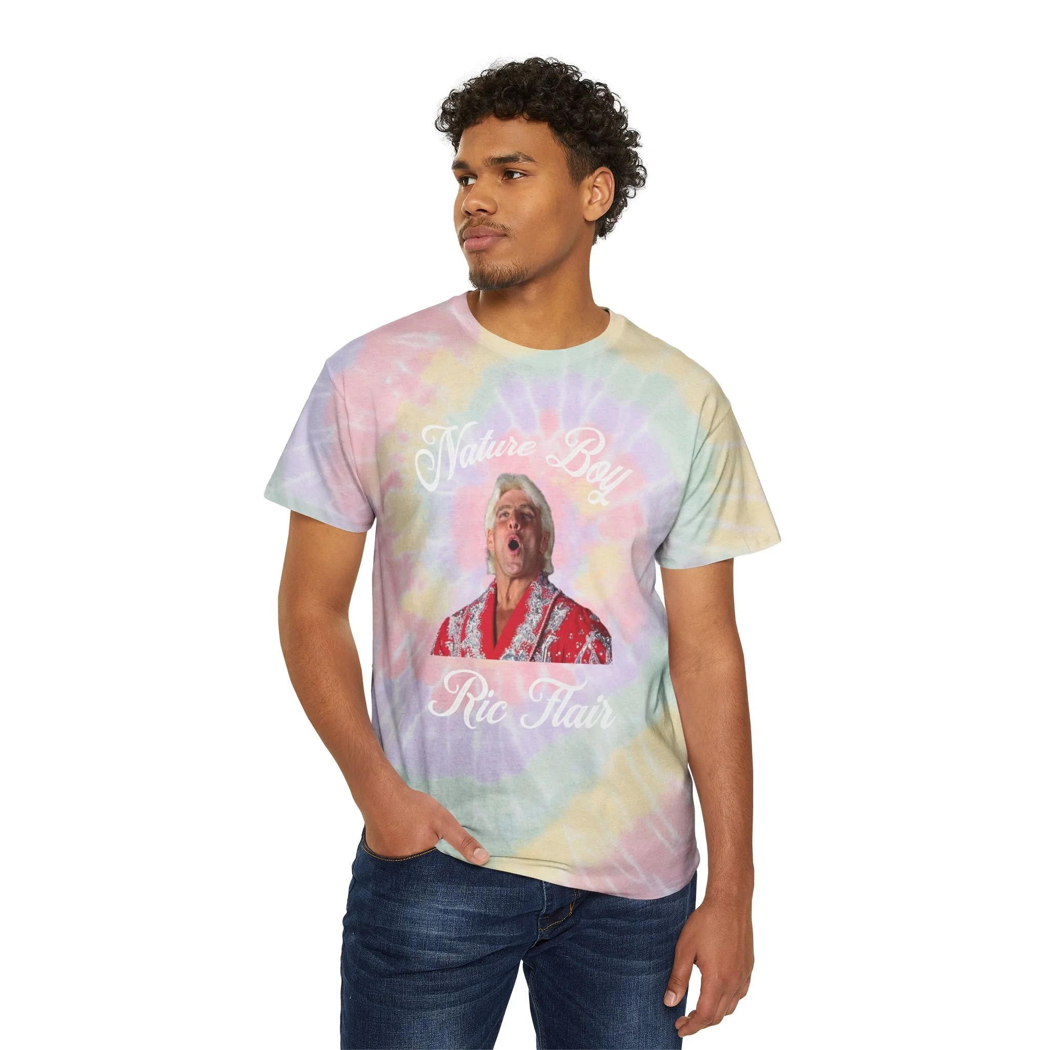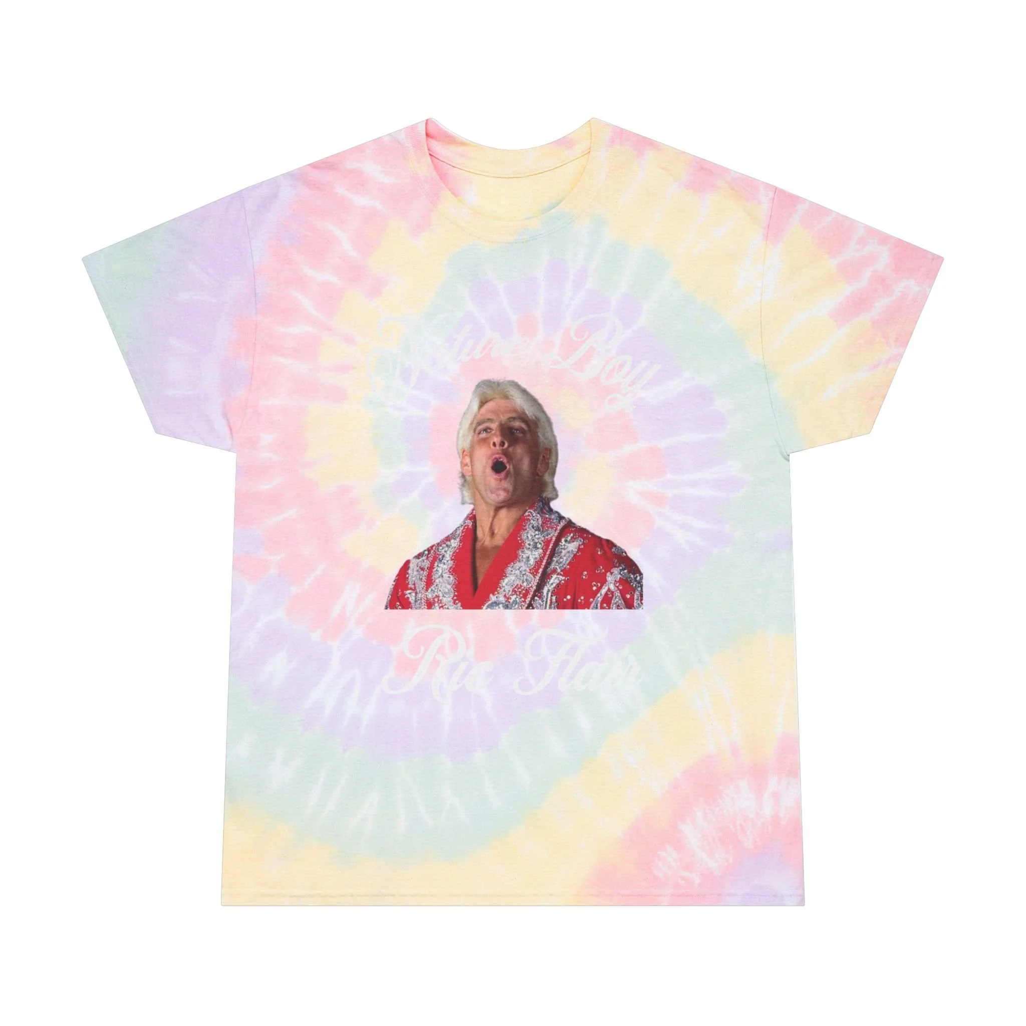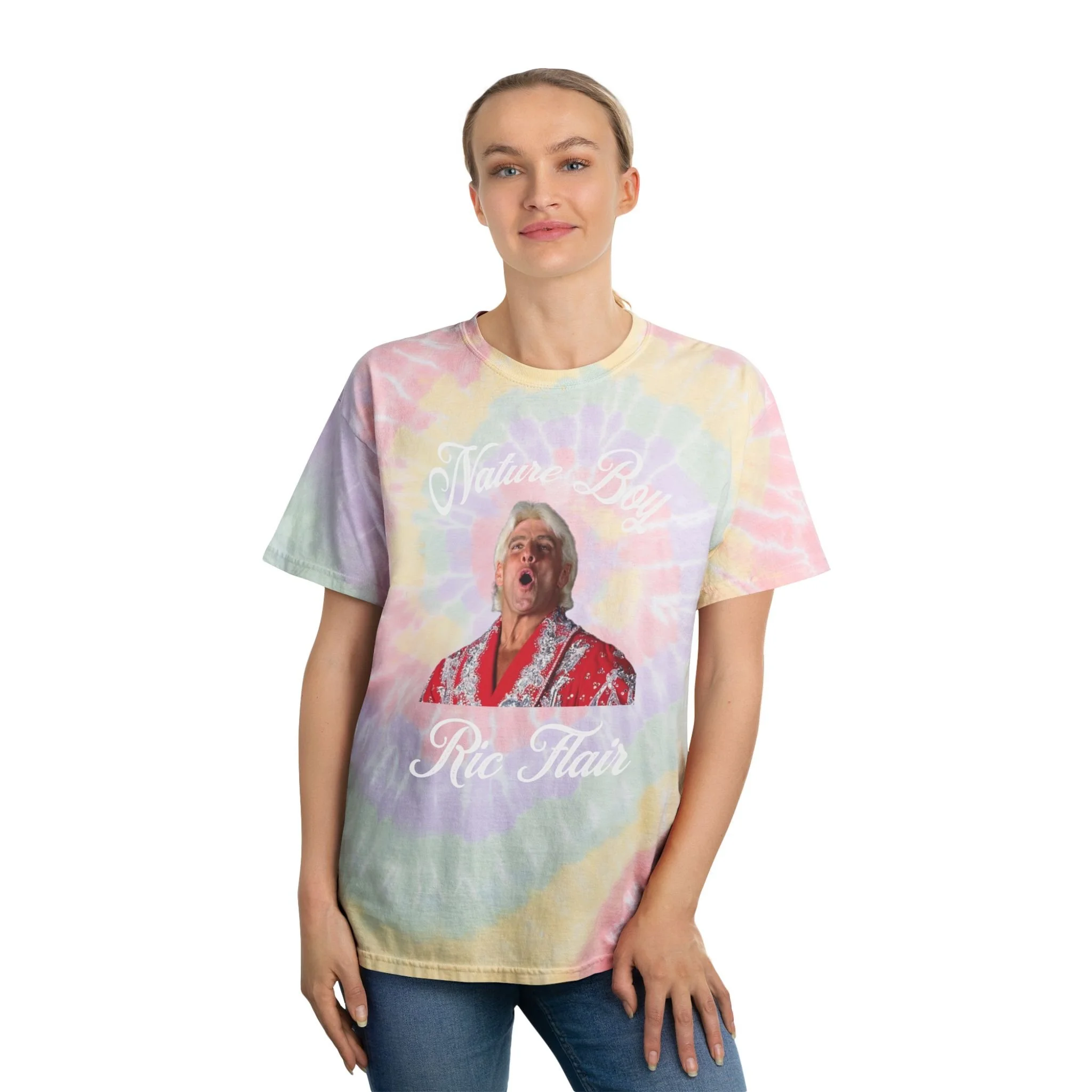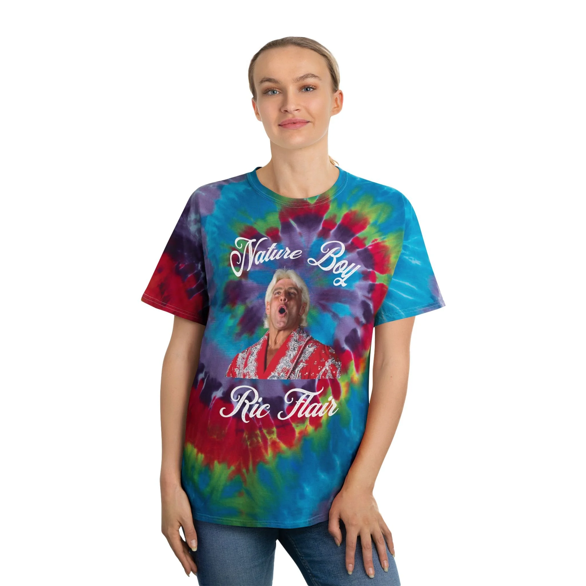 Nature-inspired tie-dye tee perfect for fans of Nature Boy Ric Flair. This shirt gives off a vibrant and fun vibe, making it ideal for casual wear or attending wrestling events. It is relevant to wrestling fans, tie-dye enthusiasts, and those who appreciate unique and colorful designs. Perfect for birthdays, summer gatherings, and music festivals.